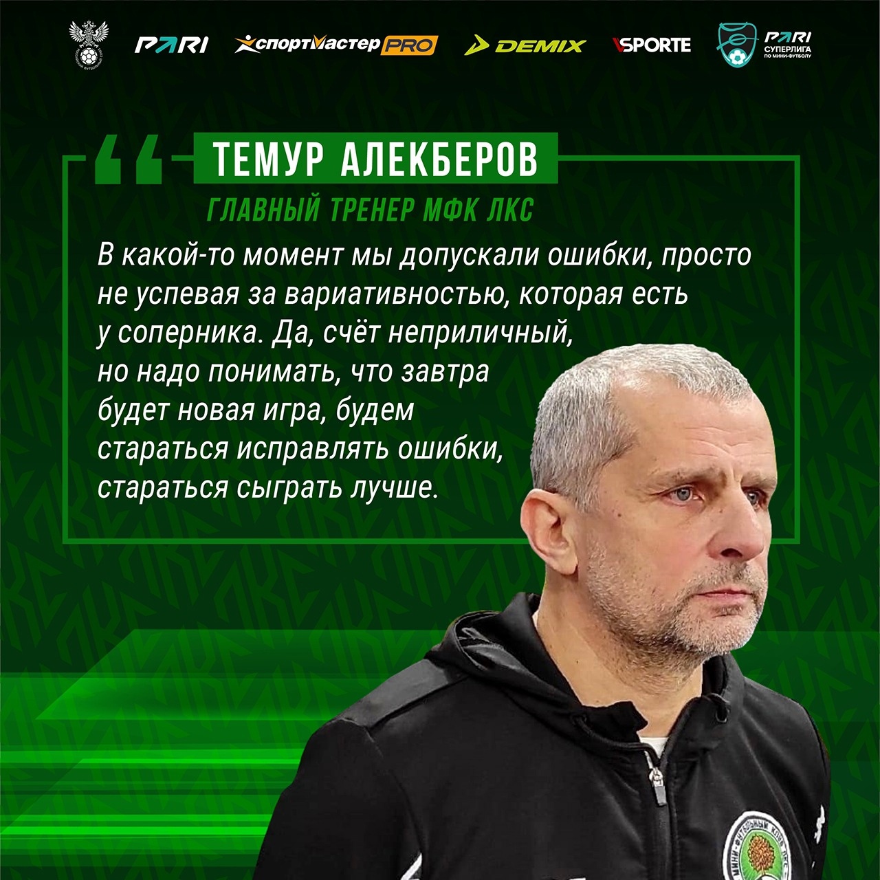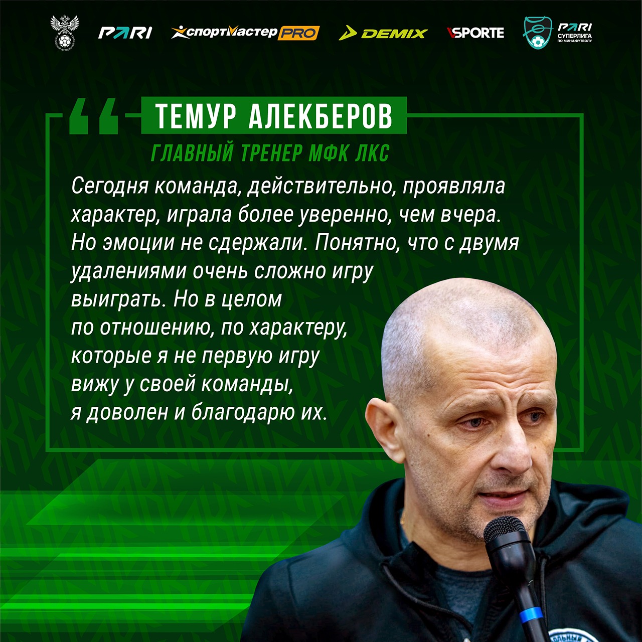 – Понятно, что интенсивность, мастерство, скорости, на которых играл соперник, нам было тяжело, – отметил главный тренер ЛКС Темур Алекберов. – В какой-то момент мы допускали ошибки, просто не успевая за вариативностью, которая есть у соперника – подключили вратаря, не подключили. Понятно, что это мастера, команда идёт на первом месте. Были хорошие кусочки, переломным был пятый мяч. Но здесь, повторюсь, очень сложно что-то сразу закрыть, соперник добавляет, играет на той скорости, которую весь матч нам выдерживать пока сложно. Ничего суперстрашного не произошло. Да, счёт неприличный, но надо понимать, что завтра будет новая игра, будем стараться исправлять ошибки, стараться сыграть лучше. Постараемся сыграть так, как мы можем сыграть. Сегодня мы не смогли навязать свою игру, мы подстраивались под игру соперника. Там есть мастера, которые в этой среде чувствуют себя замечательно и прекрасно этим пользуются.