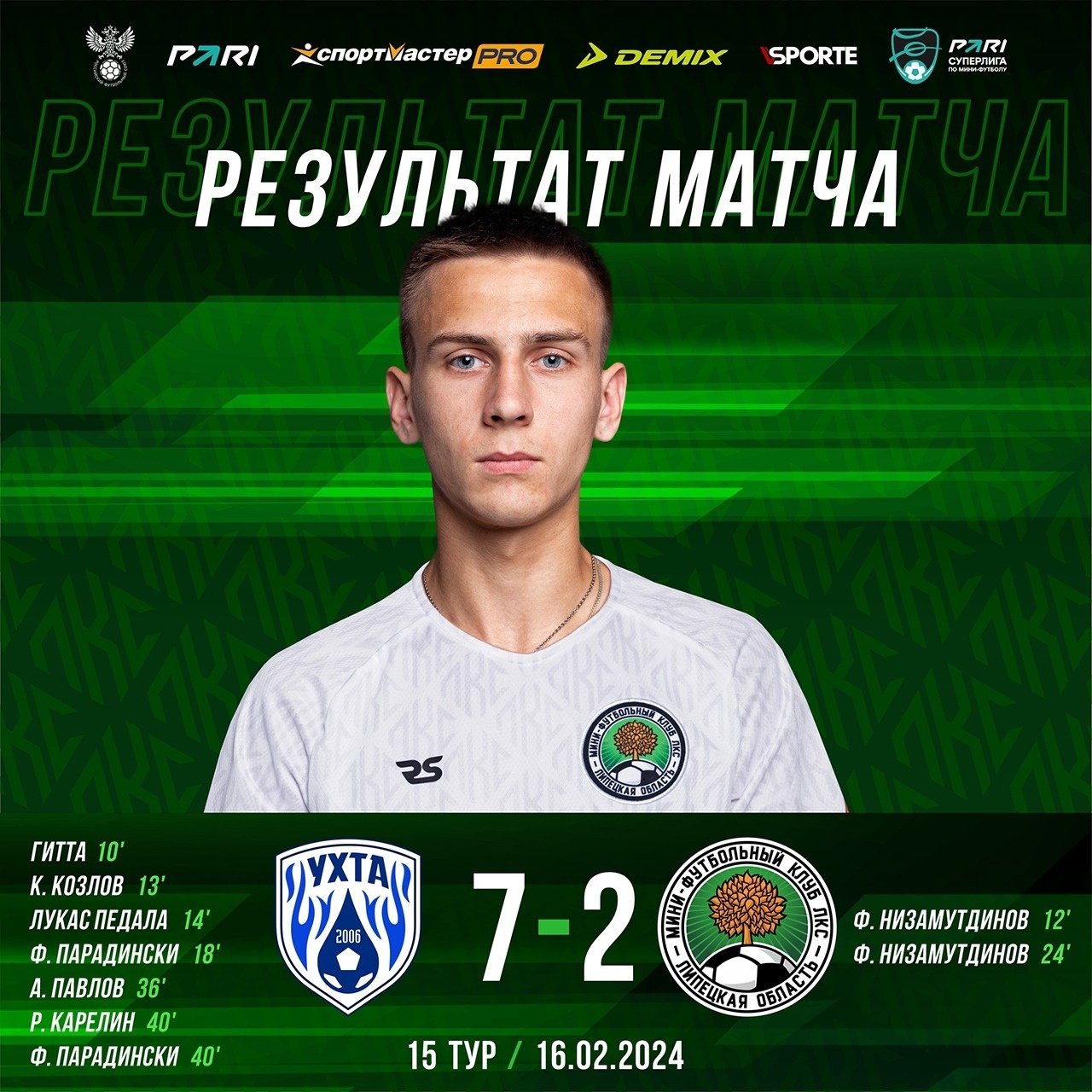 МФК «Ухта» (Ухта) – МФК ЛКС (Липецкая область) – 7:2 (4:1). PARI – Суперлига / Чемпионат России по мини-футболу среди мужских команд / сезон 2023/24, 15 тур, первый матч. 16 февраля 2024 года. УСК «Ухта» (Ухта, Тиманская, 6). Голы: Гитта — 10 мин (1:0), Фидан Низамутдинов — 12 мин (1:1), Кирилл Козлов — 13 мин (2:1), Лукас Педала — 14 мин (3:1), Фелипе Парадински — 18 мин (4:1), Фидан Низамутдинов — 24 мин (4:2), Андрей Павлов — 36 мин (5:2), Роман Карелин — 40 мин (6:2), Фелипе Парадински — 40 мин (7:2). Нереализованный 10-метровый: Фелипе Парадински – 17 мин. Предупреждения: Александр Серёгин. Фолы: 1 тайм — 3/6, 2 тайм — 2/3. В 15-м туре мини-футбольный клуб ЛКС играет в Ухте с лидером PARI – Суперлиги. По сравнению с недавней встречей в Кубке лиги в составе «Ухты» были все сильнейшие, игроки вернулись из сборных в приподнятом настроении. Так, голкипер Гитта стал обладателем Кубка Америки в составе сборной Бразилии. Не досчитались ухтинцы лишь отбывавшего дисквалификацию Бруно. Начало осталось за хозяевами паркета, которые в первые минуты создали несколько опасных моментов у ворот Леона Геджуа. На 8-й минуте липчане ответили ударом Янника в штангу. На 10-й минуте счёт был открыт после подключения к атаке и удара голкипера «Ухты». На 11-й минуте Евгений Мурашов мог забить ответный гол, но с близкого расстояния пробил в Янника, который мешал обзору Гитте. А вот в следующей атаке Фидан Низамутдинов воспользовался ошибкой Дмитрия Прудникова и точно пробил в дальний угол – 1:1. Однако хозяева вновь вышли вперёд, Кирилл Козлов замкнул передачу Лукаса Педалы на дальней штанге. На 14-й минуте счёт стал 3:1, Лукас Педала уже сам откликнулся на передачу на дальней штанге и в подкате отправил мяч в сетку. На 17-й минуте игроки ЛКС заработали шестой командный фол, но Леон Геджуа отразил удар с десяти метров лучшего бомбардира Суперлиги Фелипе Парадински. Однако в следующей же атаке Парадински всё-таки забил, вновь замкнув передачу партнёра на дальней штанге. 4:1 – с таким счётом команды ушли на перерыв.