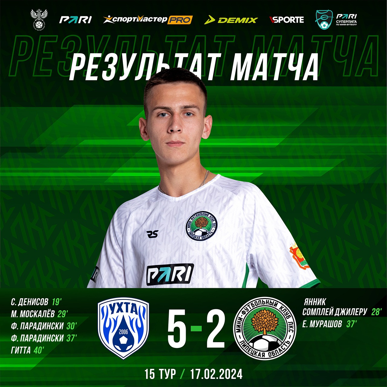 МФК «Ухта» (Ухта) – МФК ЛКС (Липецкая область) – 5:2 (1:0). PARI – Суперлига / Чемпионат России по мини-футболу среди мужских команд / сезон 2023/24, 15 тур, второй матч. 17 февраля 2024 года. УСК «Ухта» (Ухта, Тиманская, 6). Голы: Сергей Денисов — 19 мин (1:0), Янник Сомплей Джилеру — 28 мин (1:1), Михаил Москалёв — 29 мин (2:1), Фелипе Парадински — 30 мин (3:1), Фелипе Парадински — 37 мин (4:1), Евгений Мурашов — 37 мин (4:2), Гитта — 40 мин (5:2). Нереализованный 10-метровый: Олег Кручинин – 39 мин. Предупреждения: Михаил Москалёв, Фелипе Парадински, Дмитрий Прудников / Александр Серёгин, Руслан Курбанов. Удаления: Руслан Курбанов — 20 мин, Александр Серёгин — 29 мин. Фолы: 1 тайм — 3/3, 2 тайм — 6/3.