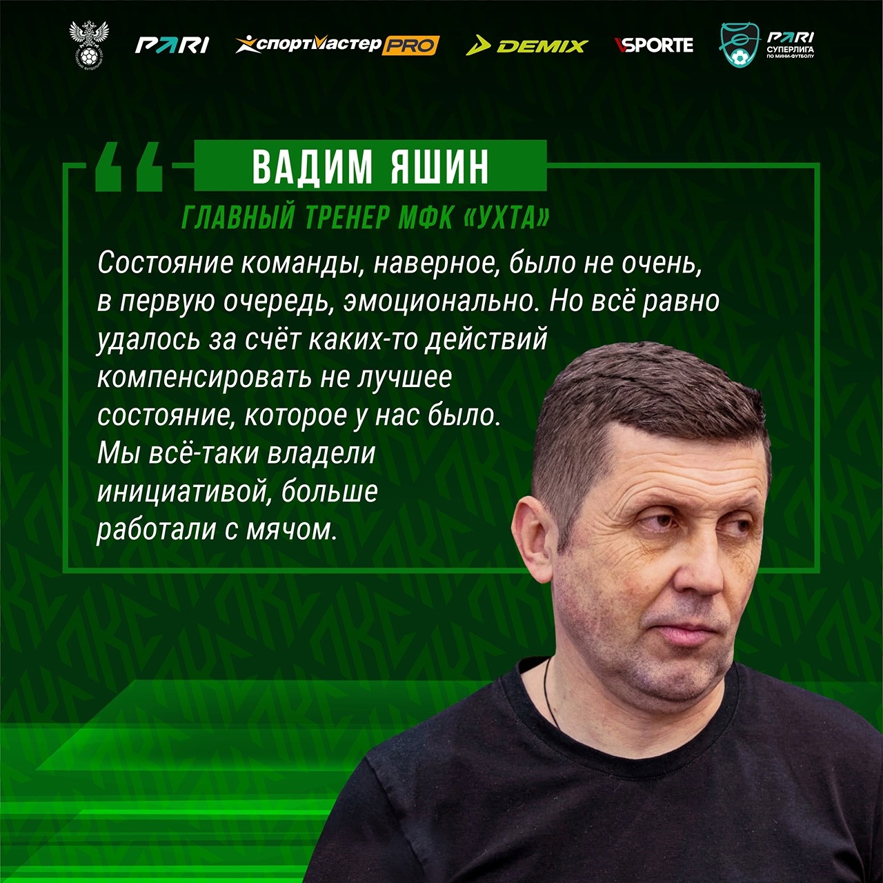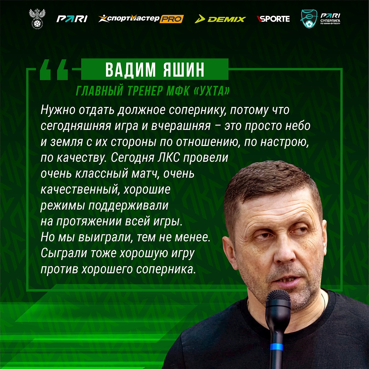 – Считаю, у нас сегодня не всё получилось, – сказал после матча наставник «Ухты» Вадим Яшин. – Состояние команды, наверное, было не очень, в первую очередь, эмоционально. Всё-таки мы много эмоций отдали на Кубке лиги, и сегодня не получилось на таких же эмоциях зайти в игру. Тем не менее, ребята видно было, что старались. Кто-то очень много пропустил, как тот же Лукас Педала. Но всё равно удалось за счёт каких-то действий компенсировать не лучшее состояние, которое у нас было. Мы всё-таки владели инициативой, больше работали с мячом. Возможно, от ЛКС ждали в какой-то момент более агрессивных действий в прессинге. Но они выбрали другой план на игру, и это, в принципе, их право.