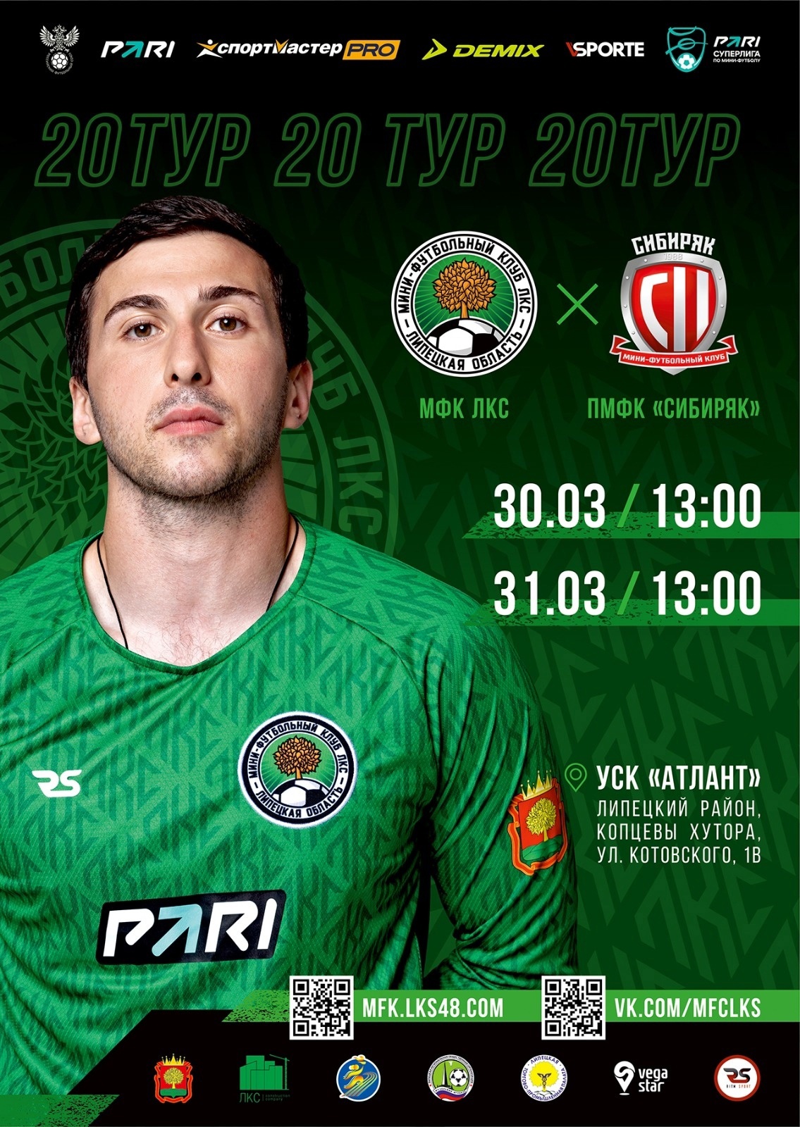На этой неделе мини-футбольный клуб ЛКС проведёт два домашних матча 20-го тура PARI – Суперлиги чемпионата России по мини-футболу 2023/24 с ПМФК «Сибиряк» (Новосибирск). Игры состоятся 30 и 31 марта (суббота и воскресенье) в спорткомплексе «Атлант» (Липецкий район, Копцевы хутора, Котовского, 1В). Начало – в 13:00.