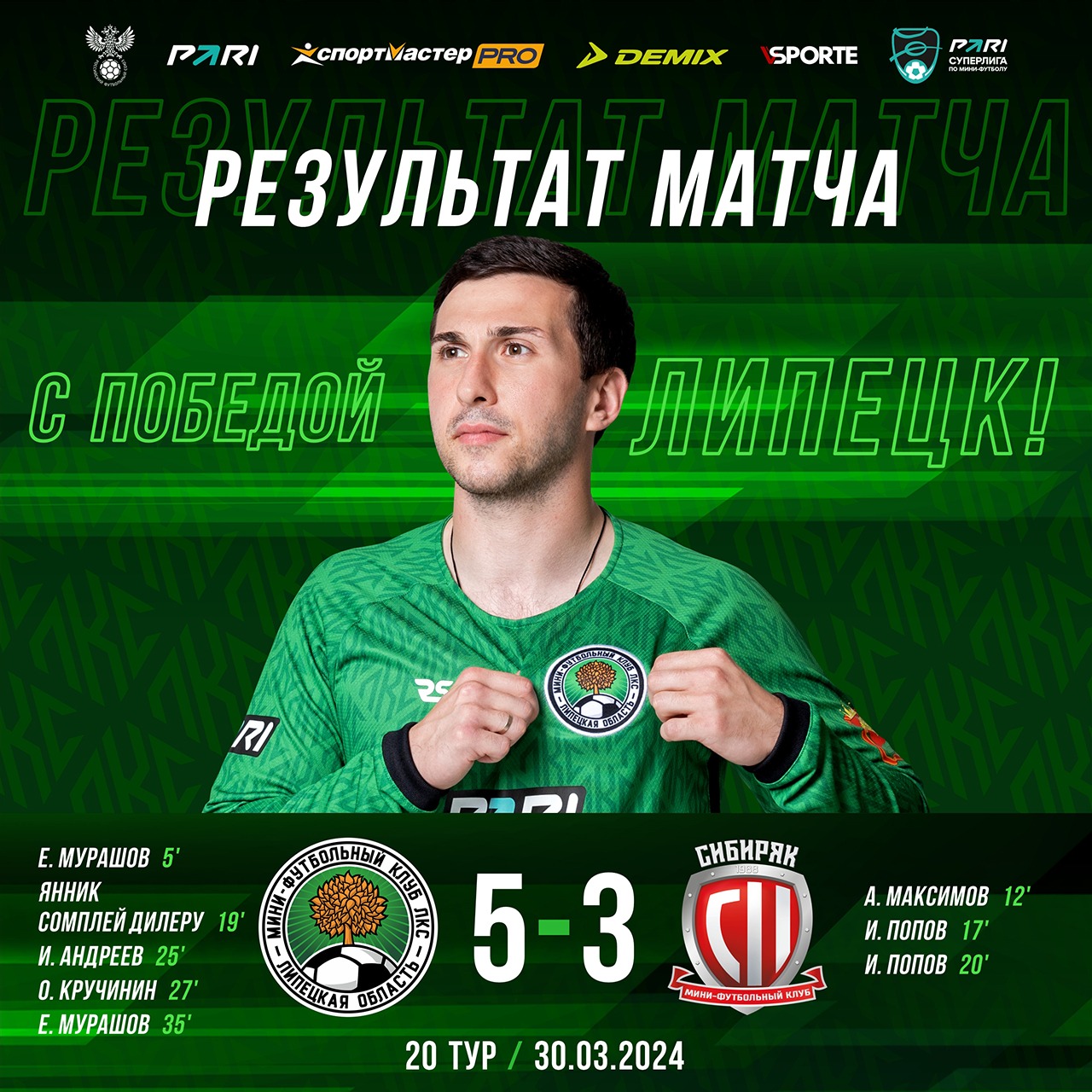 МФК ЛКС (Липецкая область) – ПМФК «Сибиряк» (Новосибирск) – 5:3 (2:3). PARI – Суперлига / Чемпионат России по мини-футболу среди мужских команд / сезон 2023/24, 20 тур, первый матч. 30 марта 2024 года. УСК «Атлант» (Липецкий район, Копцевы Хутора, ул. Котовского, 1В). Голы: Евгений Мурашов — 5 мин (1:0), Артëм Максимов — 12 мин (1:1), Илья Попов — 17 мин (1:2), Янник Сомплей Дилеру — 19 мин (2:2), Илья Попов — 20 мин (2:3), Илья Андреев — 25 мин (3:3), Олег Кручинин — 27 мин (4:3), Евгений Мурашов — 35 мин (5:3). Нереализованный 6-метровый: Денис Гуляйкин – 25 мин. Предупреждения: Олег Кручинин, Александр Дунец, Денис Гуляйкин / Дмитрий Катанэ. Фолы: 1 тайм — 4/2, 2 тайм — 3/5.