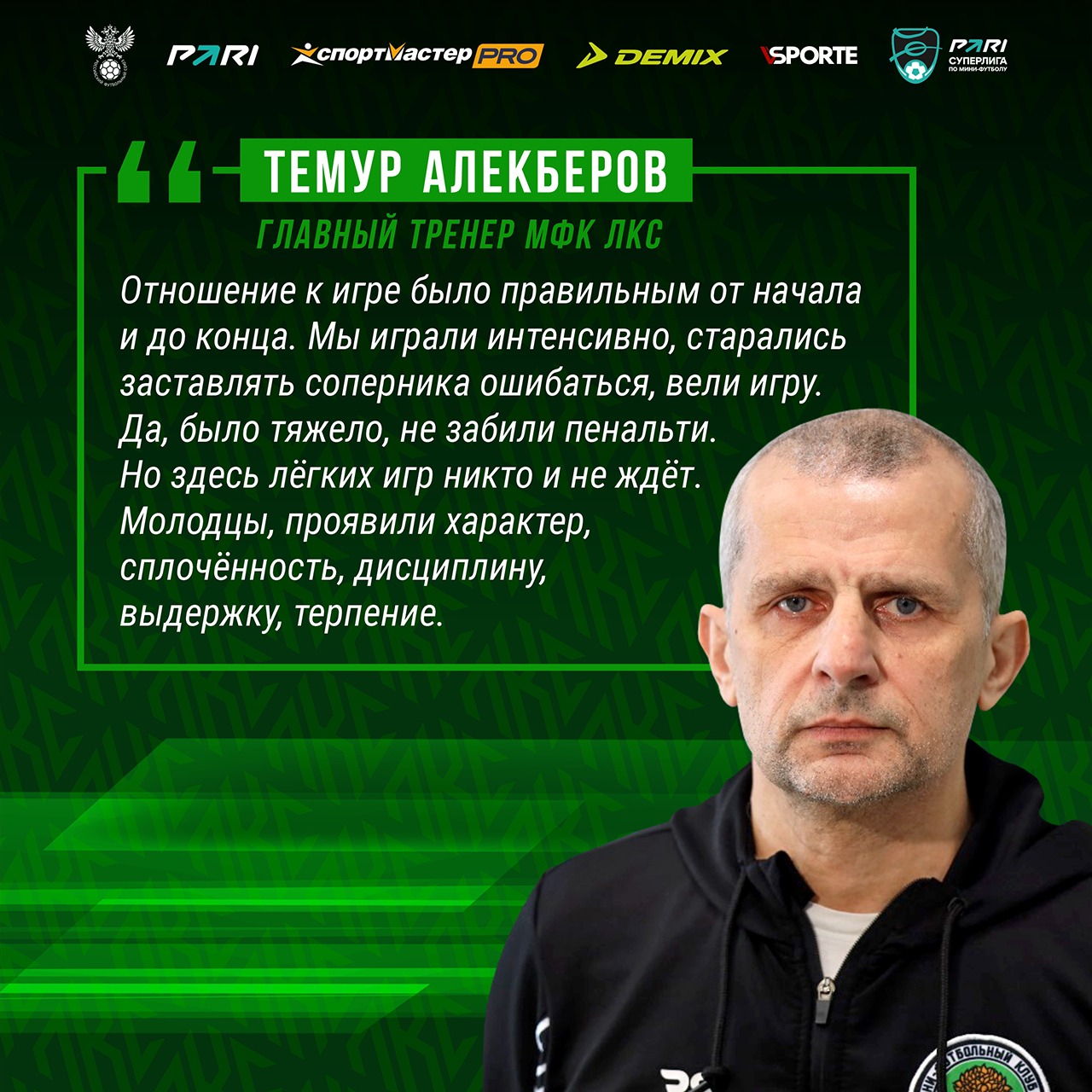 – Я могу по всей игре сказать. Мне кажется, а я стараюсь всё-таки быть объективным, мы играли хорошо, и нельзя сказать, что мы в первом тайме играли плохо, – прокомментировал игру своих подопечных главный тренер ЛКС Темур Алекберов. – Да, были какие-то моменты, где мы индивидуально ошибались и пропустили свои голы. Но в целом отношение к игре было правильным от начала и до конца. Мы играли интенсивно, старались заставлять соперника ошибаться, вели игру. Да, было тяжело, не забили пенальти. Но здесь лёгких игр никто и не ждёт. Молодцы, проявили характер, сплочённость, дисциплину, выдержку, терпение. Это тоже было необходимо во втором тайме, играть терпеливо. Мы проигрывали, надо отыгрываться, но в то же время и в обороне надо отрабатывать. Все собрались и, действительно, очень ответственно подошли и к игре, и ко второму тайму в особенности.
