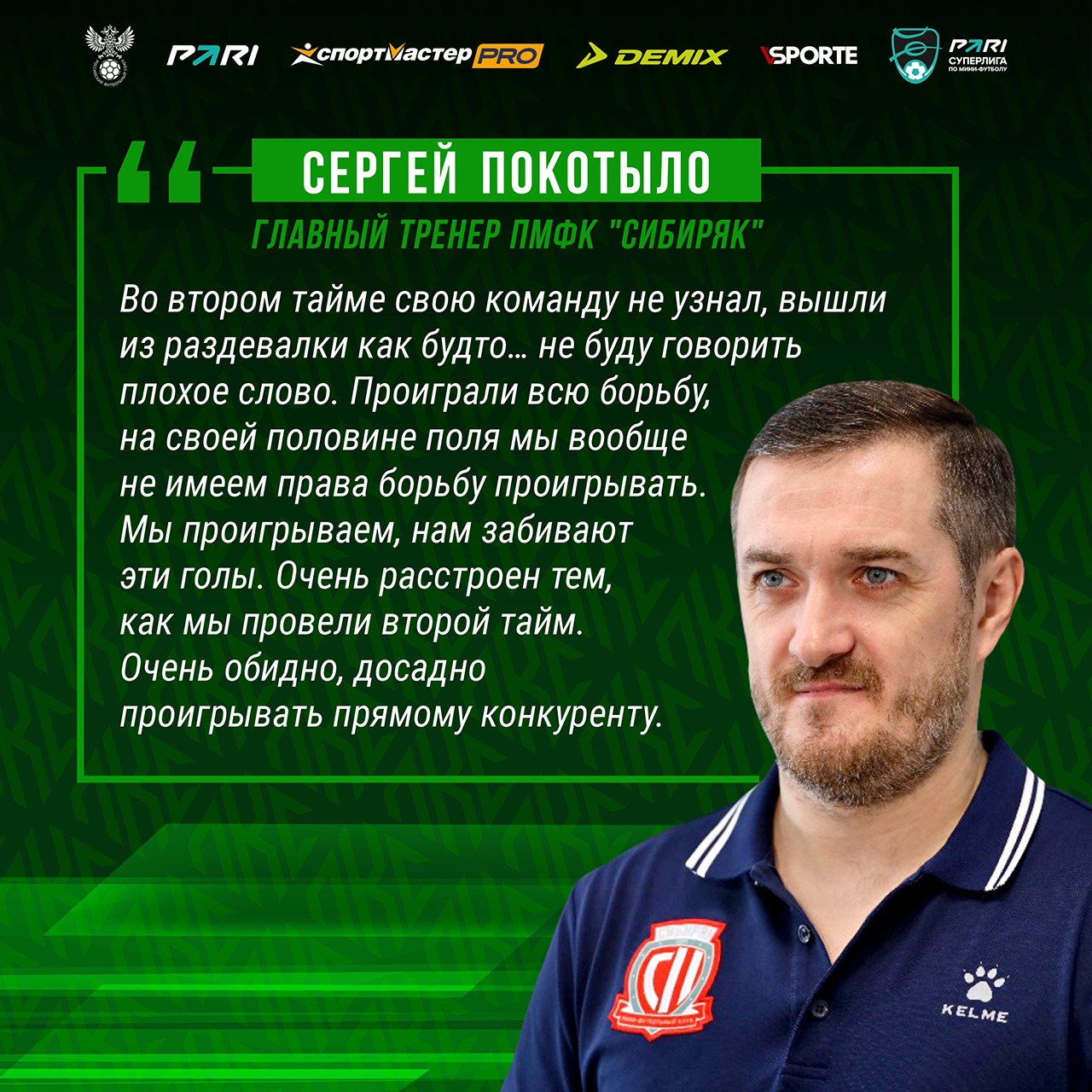 – Проиграли, какие могут быть комментарии. Очень плохо, недовольны, – сказал после матча главный тренер «Сибиряка» Сергей Покотыло. – За первый тайм команде спасибо, очень здорово, хорошо играли. Много поймали контратак, забили хорошие голы. Во втором тайме свою команду не узнал, вышли из раздевалки как будто… не буду говорить плохое слово. Команда вообще не узнаваема была. Проиграли всю борьбу, на своей половине поля мы вообще не имеем права борьбу проигрывать. Мы проигрываем, нам забивают эти голы. Очень расстроен тем, как мы провели второй тайм. Очень обидно, досадно проигрывать прямому конкуренту. Завтра ещё есть день, чтобы отмазаться. Посмотрим, проанализируем, что-то поменяем. Много чего не нравится, много индивидуальных ошибок.
