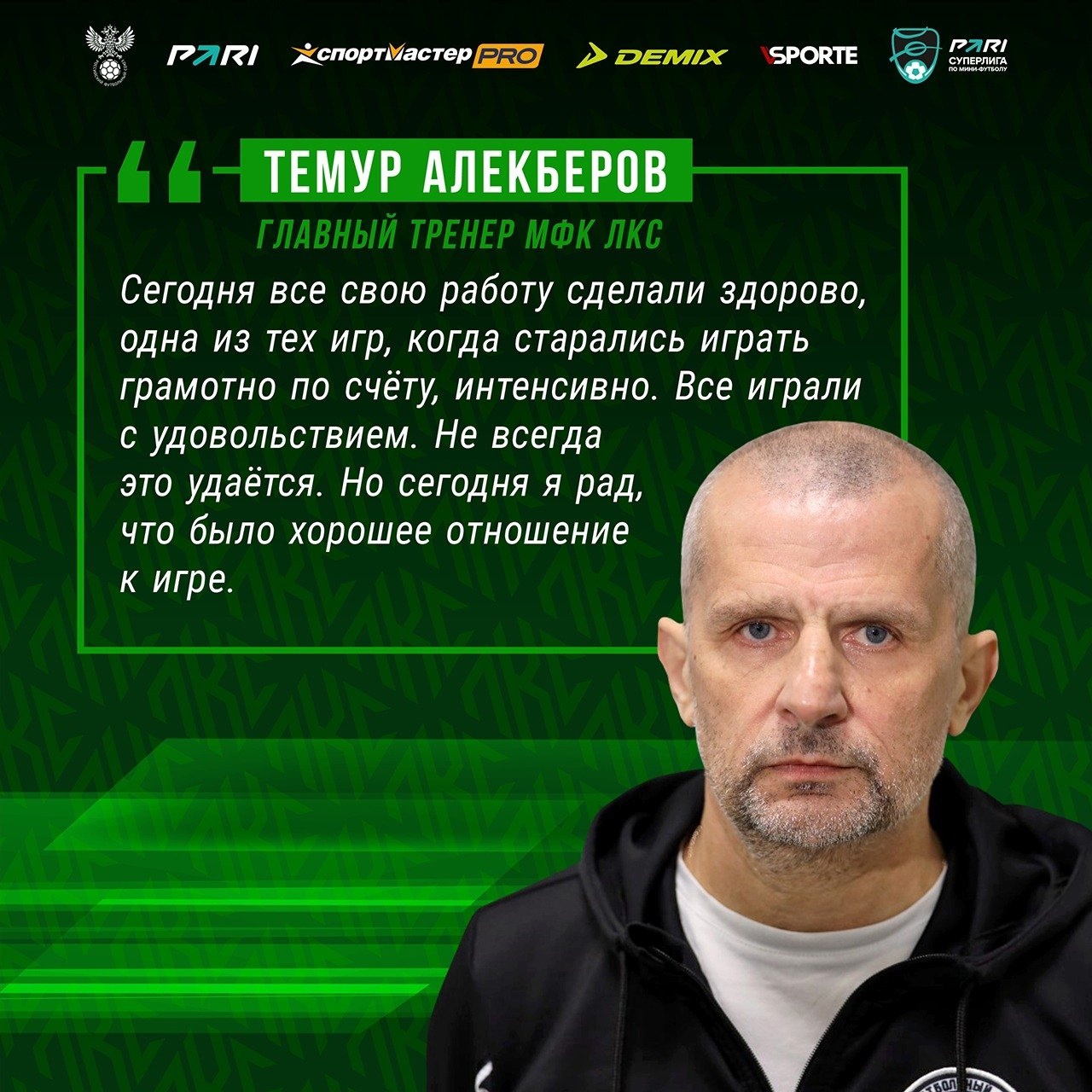 – Было видно, что хорошее отношение к игре, – отметил после матча главный тренер ЛКС Темур Алекберов. – Интенсивность, играли на максимуме, старались действовать на большой скорости, забили хорошие голы. Да, кусочками мы игру отпускали, и были моменты. Но опять же выручил вратарь. Сегодня все свою работу сделали здорово, одна из тех игр, когда старались играть грамотно по счёту, интенсивно. Все играли с удовольствием. Не всегда это удаётся. Но сегодня я рад, что было хорошее отношение к игре. То, что требовали от футболистов, все старались выполнять, каждый хотел сыграть здорово. В итоге получился хороший результат.