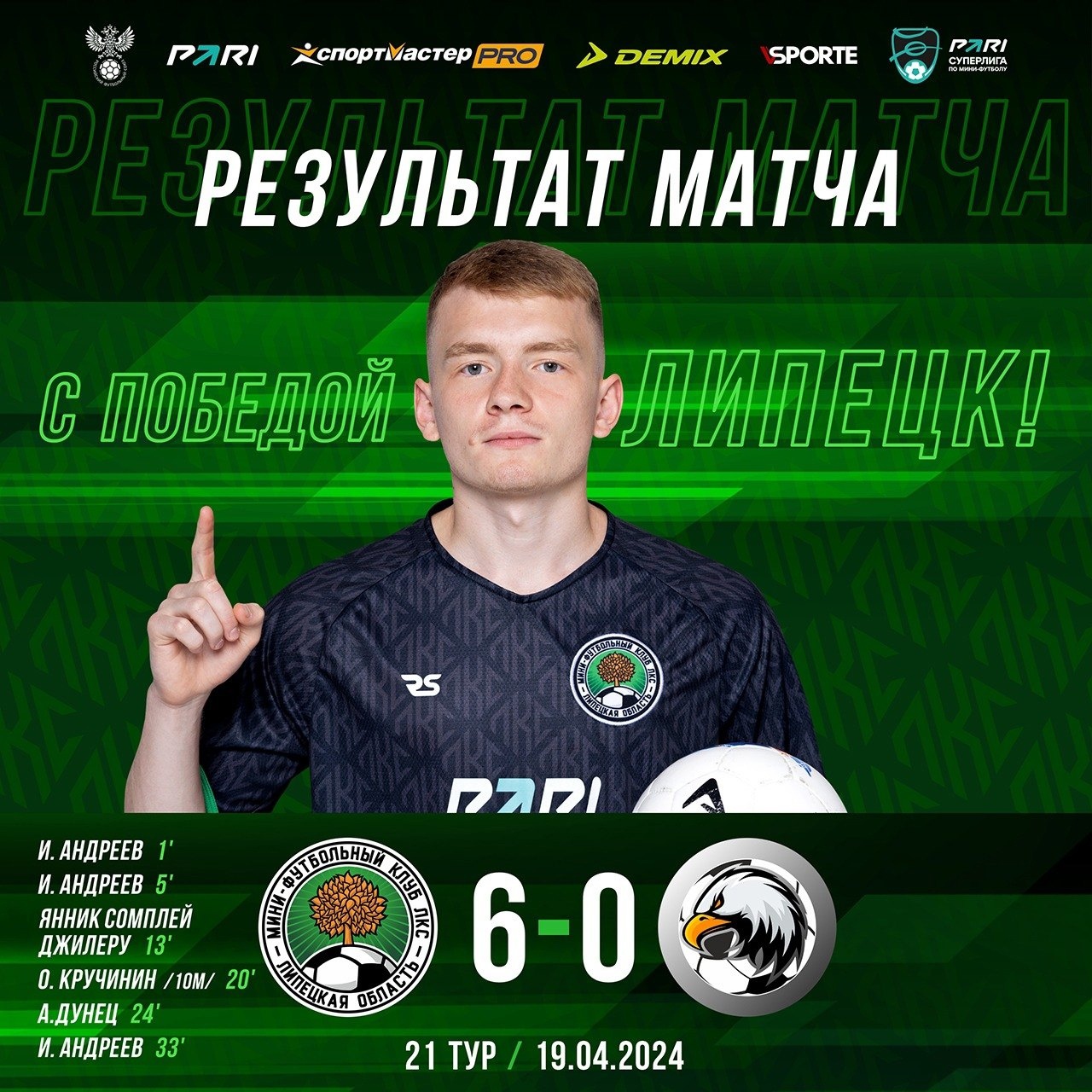МФК ЛКС (Липецкая область) – МФК «Сиб-Транзит» (Новокузнецк) – 6:0 (4:0). PARI – Суперлига / Чемпионат России по мини-футболу среди мужских команд / сезон 2023/24, 21 тур, первый матч. 19 апреля 2024 года. УСК «Атлант» (Липецкий район, Копцевы Хутора, ул. Котовского, 1В). Голы: Илья Андреев — 1 мин (1:0), Илья Андреев — 5 мин (2:0), Янник Сомплей Джилеру — 13 мин (3:0), Олег Кручинин (10 м) — 20 мин (4:0), Александр Дунец — 24 мин (5:0), Илья Андреев — 33 мин (6:0). Нереализованные 10-метровые: Александр Коробейников – 31 мин, Фидан Низамутдинов – 38 мин. Предупреждения: Александр Серëгин, Руслан Курбанов, / Игорь Зайков, Иван Мартынов. Фолы: 1 тайм — 4/6, 2 тайм — 5/7.