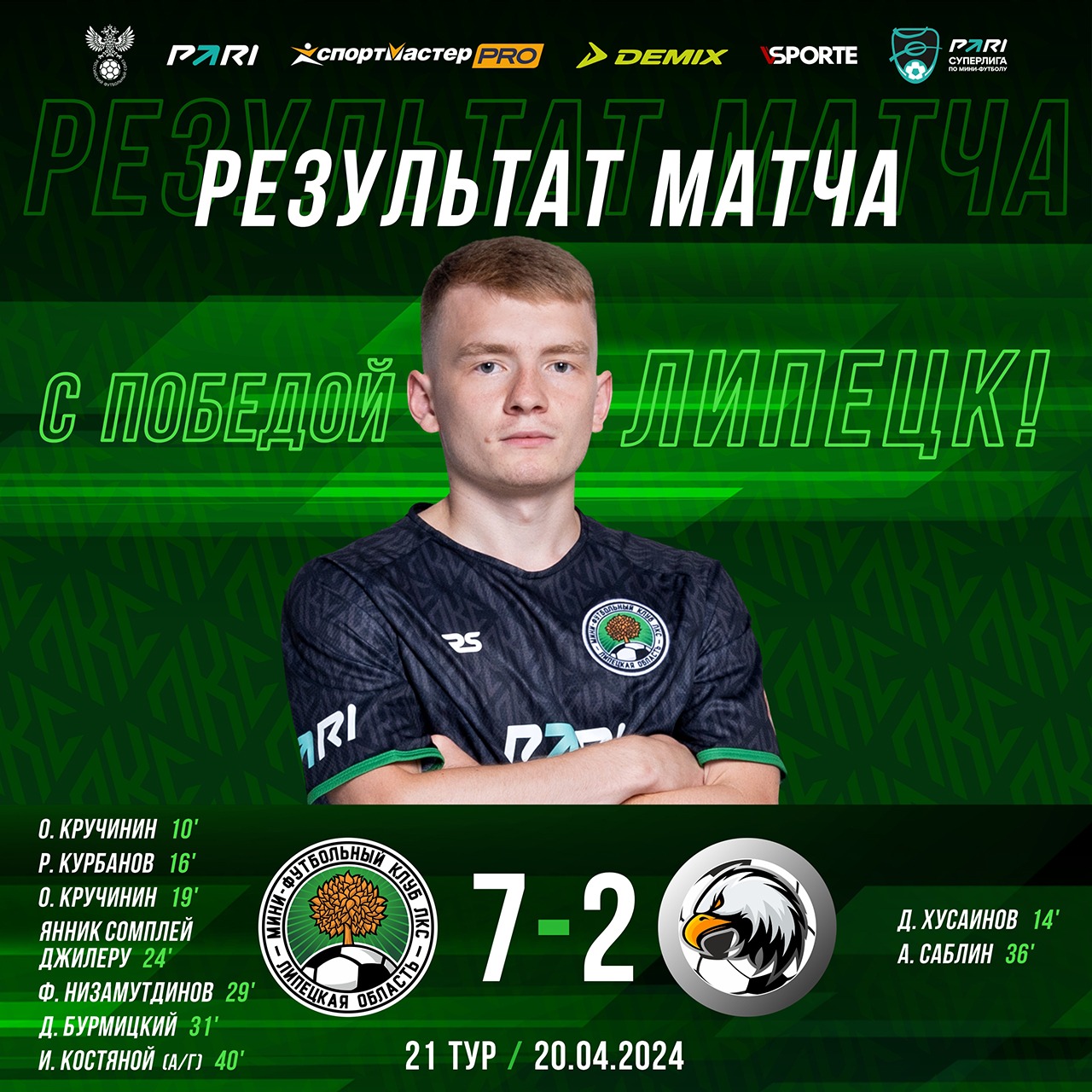 МФК ЛКС (Липецкая область) – МФК «Сиб-Транзит» (Новокузнецк) – 7:2 (3:1) PARI – Суперлига / Чемпионат России по мини-футболу среди мужских команд / сезон 2023/24, 21 тур, второй матч. 20 апреля 2024 года. УСК «Атлант» (Липецкий район, Копцевы Хутора, ул. Котовского, 1В). Голы: Олег Кручинин — 10 мин (1:0), Дмитрий Хусаинов — 14 мин (1:1), Руслан Курбанов — 16 мин (2:1), Олег Кручинин — 19 мин (3:1), Янник Сомплей Джилеру — 24 мин (4:1), Фидан Низамутдинов — 29 мин (5:1), Данил Бурмицкий — 31 мин (6:1), Алексей Саблин — 36 мин (6:2), Иван Костяной (а/г) — 40 мин (7:2). Предупреждение: Елисей Елисеев. Фолы: 1 тайм — 0/2, 2 тайм — 3/1.