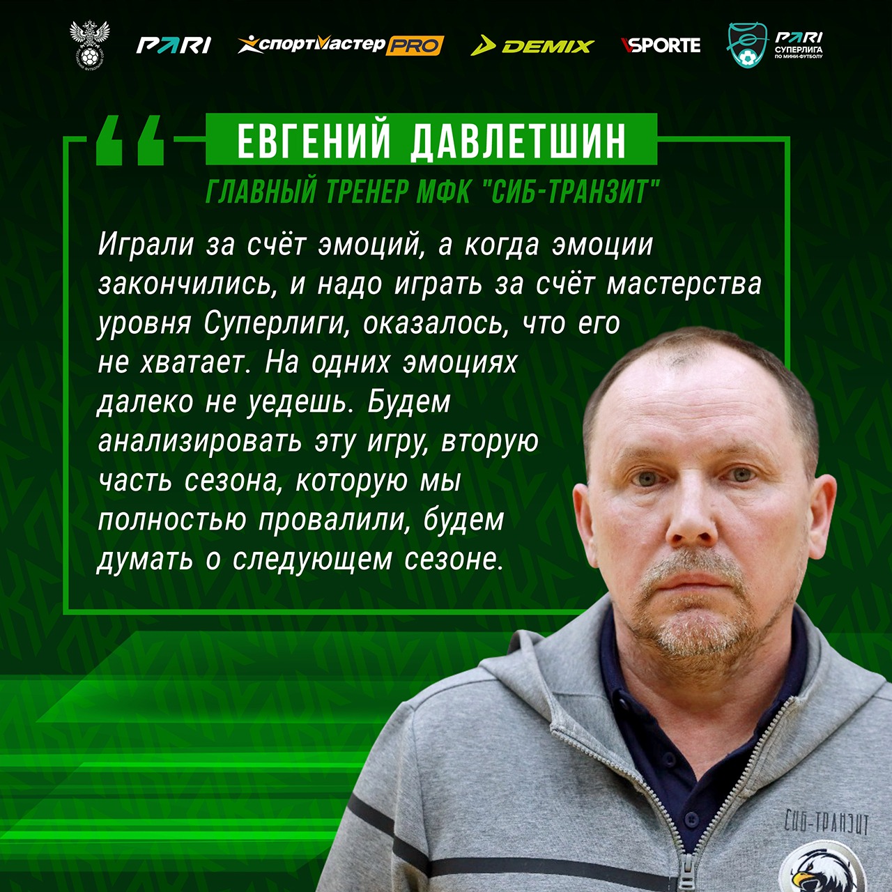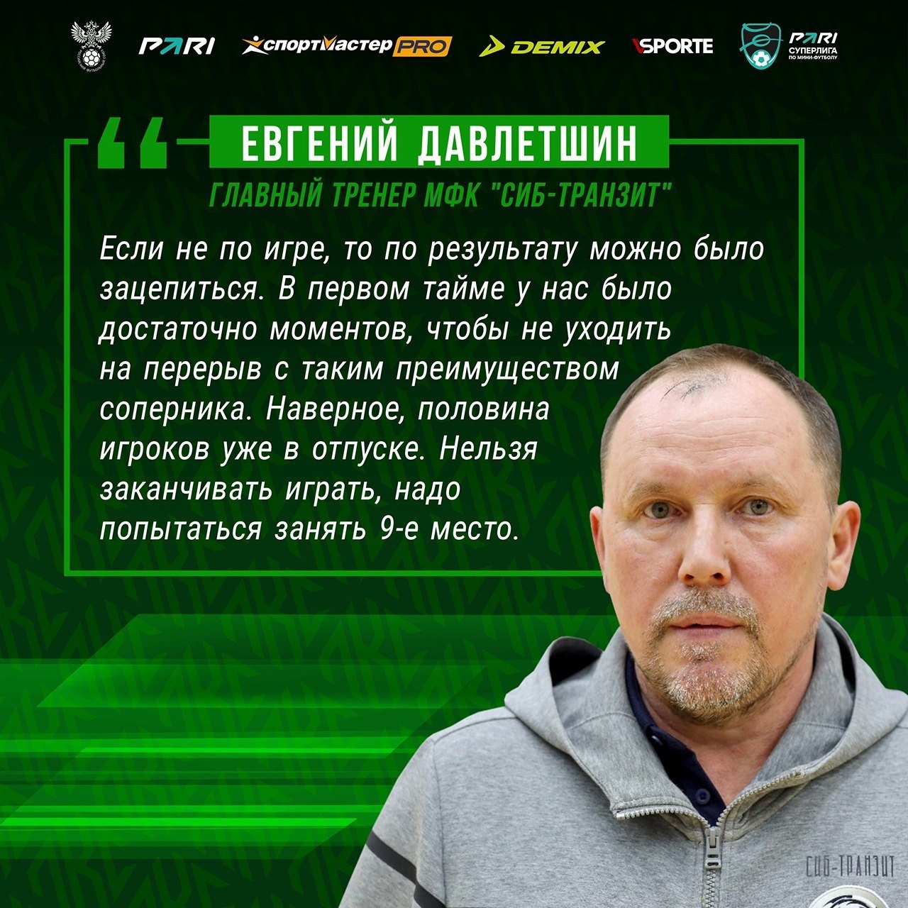 – Уже устал на такие вопросы отвечать. Ничего не получилось. Просто стыдно, – прокомментировал результат главный тренер «Сиб-Транзита» Евгений Давлетшин. – Пока у нас была цель, к который мы шли, пока у нас были шансы, мы пытались, заявляли об этом, что хотим попасть в плей-офф. Когда эта цель ушла, многие снизили даже не требования, а желание играть. Тот отрезок, который, как я считаю, мы успешно проводили, когда мы были в числе претендентов, очень красиво о нас говорили, писали... И вот здесь, может, у многих ребят ощущение значимости немного преувеличилось. Играли за счёт эмоций, а когда эмоции закончились, и надо играть за счёт мастерства уровня Суперлиги, оказалось, что его не хватает. На одних эмоциях далеко не уедешь. Будем анализировать эту игру, вторую часть сезона, которую мы полностью провалили, будем думать о следующем сезоне. Порадовала молодёжь, тот же Дятлов, Амеленюк, Умаров. Вратарь сегодня неплохо сыграл, за исключением гола, когда в штрафной он стал обыгрывать. Но для него это первая полноценная игра, колоссальный опыт. Когда перед игрой назвали состав, его трясло. Он вышел, почувствовал, молодец. Учитывая, что у клуба такое подрастающее поколение, которое в этом сезоне, в отличии от нас, успешно выступили, будем ориентироваться на них. Будем выводы обязательно делать. Можно всё проиграть, но честь и достоинство — это самое последнее.