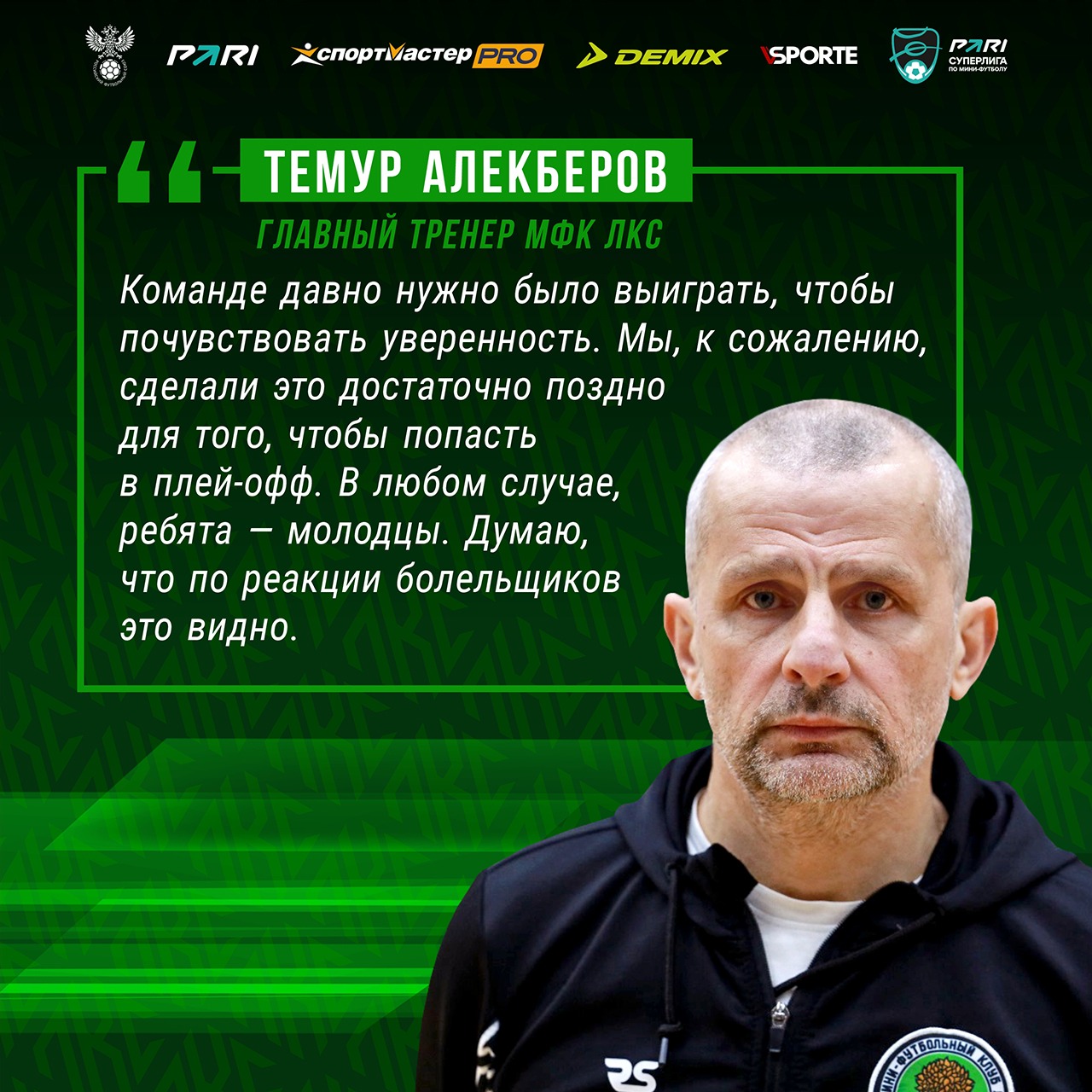 – Поначалу было видно, что чуть-чуть эмоций нам не хватает, – отметил после матча главный тренер ЛКС Темур Алекберов. – Соперник тоже хочет и борется за результат. Поэтому до середины первого тайма было сложно. Потом добавили скорости, забили голы, стало чуть легче. Выдохнули и потом уже играли с удовольствием, интенсивно, старались сыграть уверенно на победу. Видно, конечно, что команда немножко раскрепостилась. Команде давно нужно было выиграть, чтобы почувствовать уверенность. Мы, к сожалению, сделали это достаточно поздно для того, чтобы попасть в плей-офф. В любом случае, ребята — молодцы. Думаю, что по реакции болельщиков это видно. Не стыдно смотреть в глаза друг другу и болельщикам.