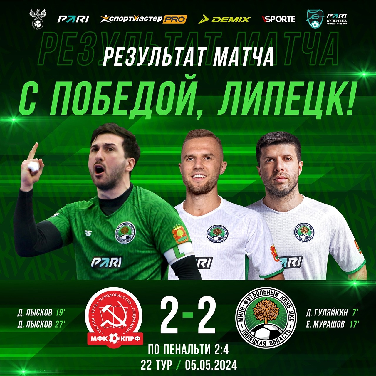 МФК КПРФ (Москва) – МФК ЛКС (Липецкая область) – 2:2 (1:2), по пенальти — 2:4. PARI – Суперлига / Чемпионат России по мини-футболу среди мужских команд / сезон 2023/24, 22 тур, второй матч. 5 мая 2024 года. УСЦ «Юность» (Климовск, проезд Юности, 1). Голы: Денис Гуляйкин — 7 мин (0:1), Евгений Мурашов — 17 мин (0:2), Дмитрий Лысков — 19 мин (1:2), Дмитрий Лысков — 27 мин (2:2). Серия пенальти: Матеуш Майя — 1:0, Денис Гуляйкин — 1:1, Арсер Багиров — 1:1, Александр Коробейников — 1:2, Сергей Орлов — 2:2, Илья Андреев — 2:3, Дмитрий Лысков — 2:3, Александр Дунец — 2:4. Предупреждения: Руслан Курбанов. Фолы: 1 тайм — 2/3, 2 тайм — 2/4.