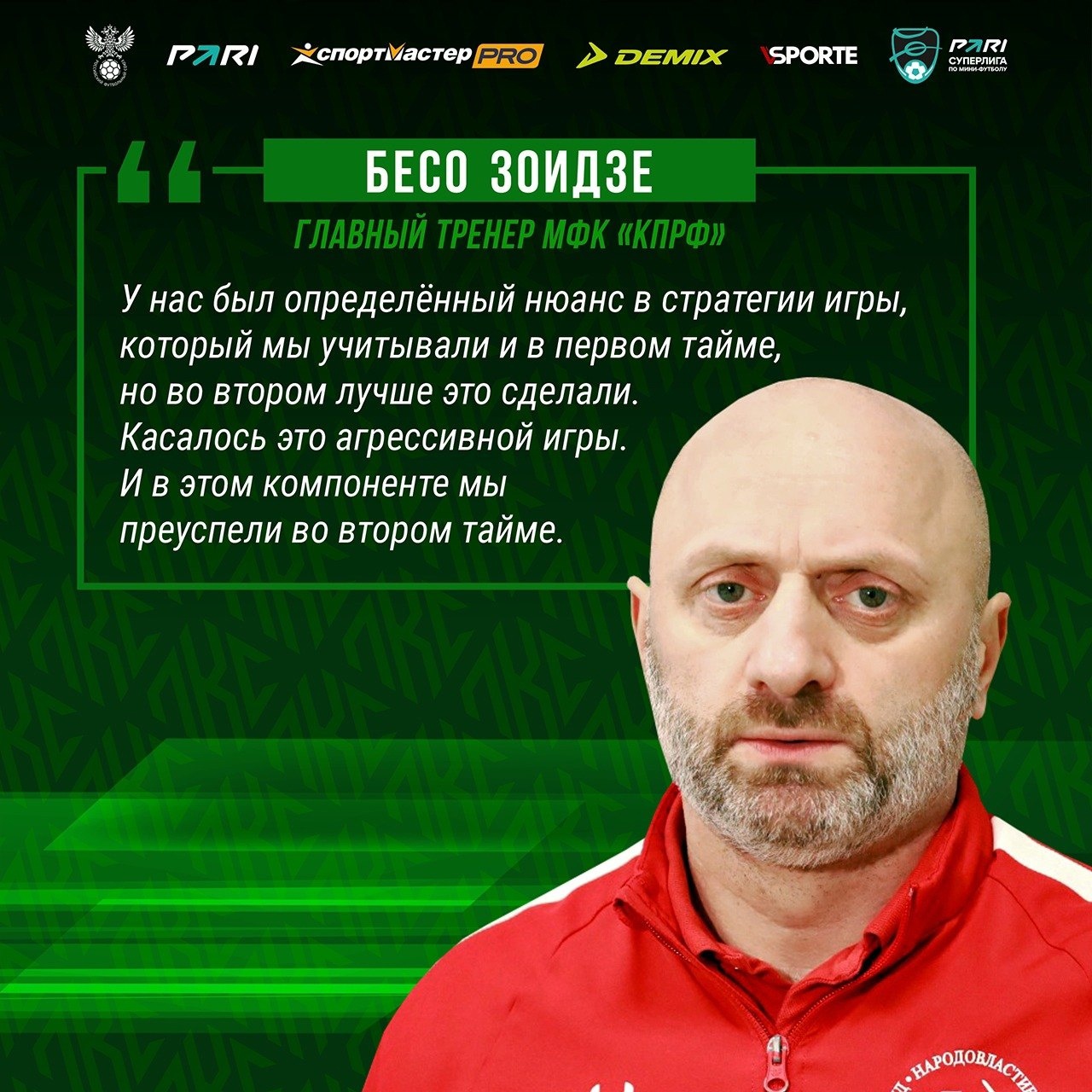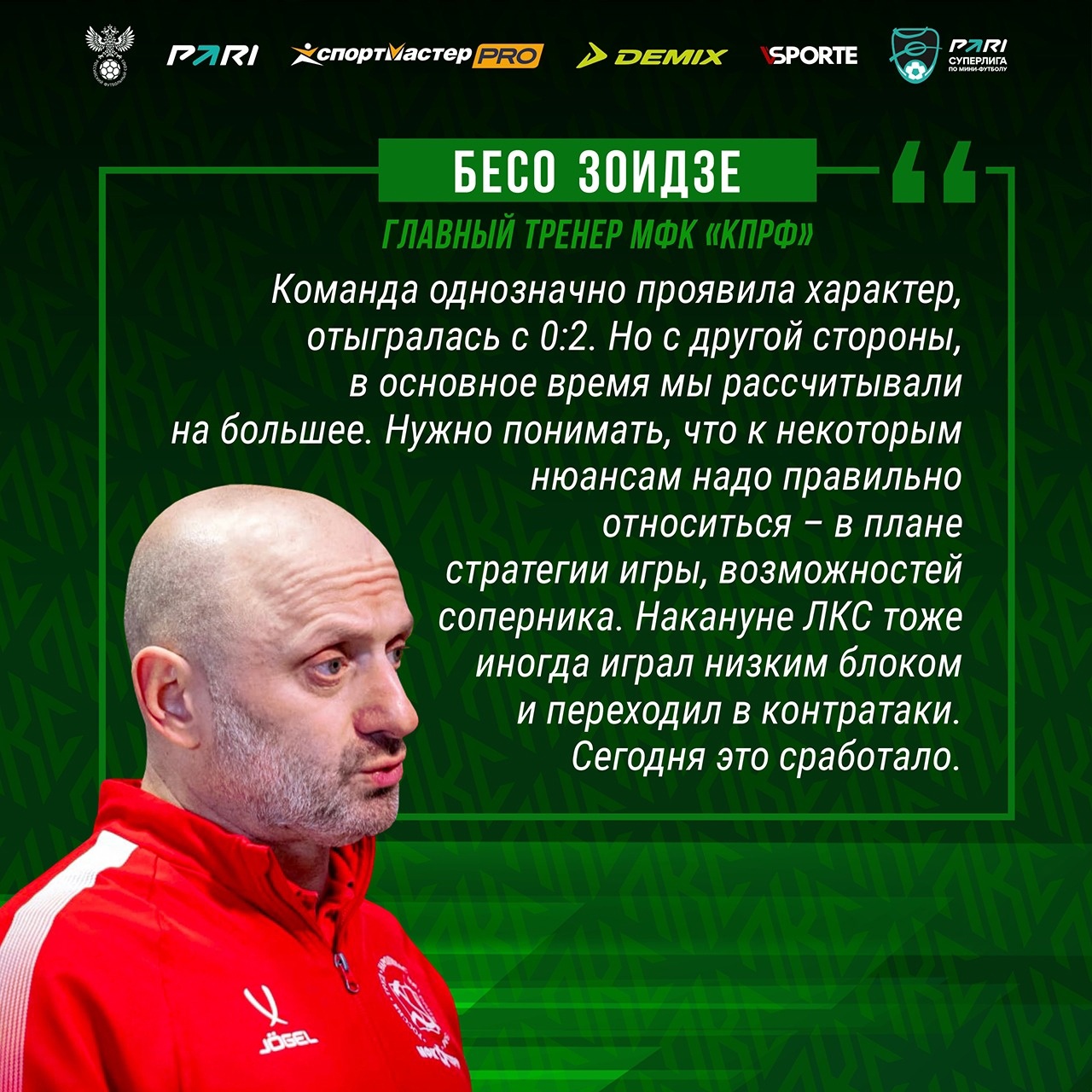 – Второй тайм мы провели намного лучше эмоционально и в позиционной атаке, – прокомментировал игру главный тренер КПРФ Бесо Зоидзе. – Не было монотонности, как в первой половине. Почему мы пропустили два мяча? При низкой обороне соперника не получалось сделать так, чтобы мяч у нас ходил быстро, не вскрыли его оборону и получили контратаки. Во втором тайме это подкорректировали, мяч быстро ходил с фланга на фланг, мы оказывали давление по периметру, и у нас было больше возможностей. Команда однозначно проявила характер, отыгралась с 0:2. Но с другой стороны, в основное время мы рассчитывали на большее. Нужно понимать, что к некоторым нюансам надо правильно относиться – в плане стратегии игры, возможностей соперника. Накануне ЛКС тоже иногда играл низким блоком и переходил в контратаки. Сегодня это сработало.