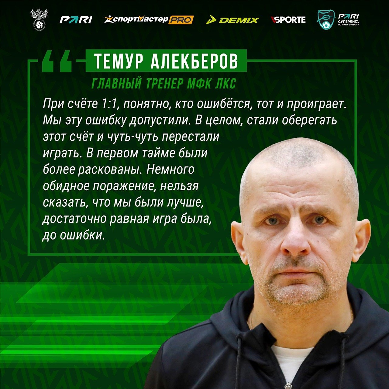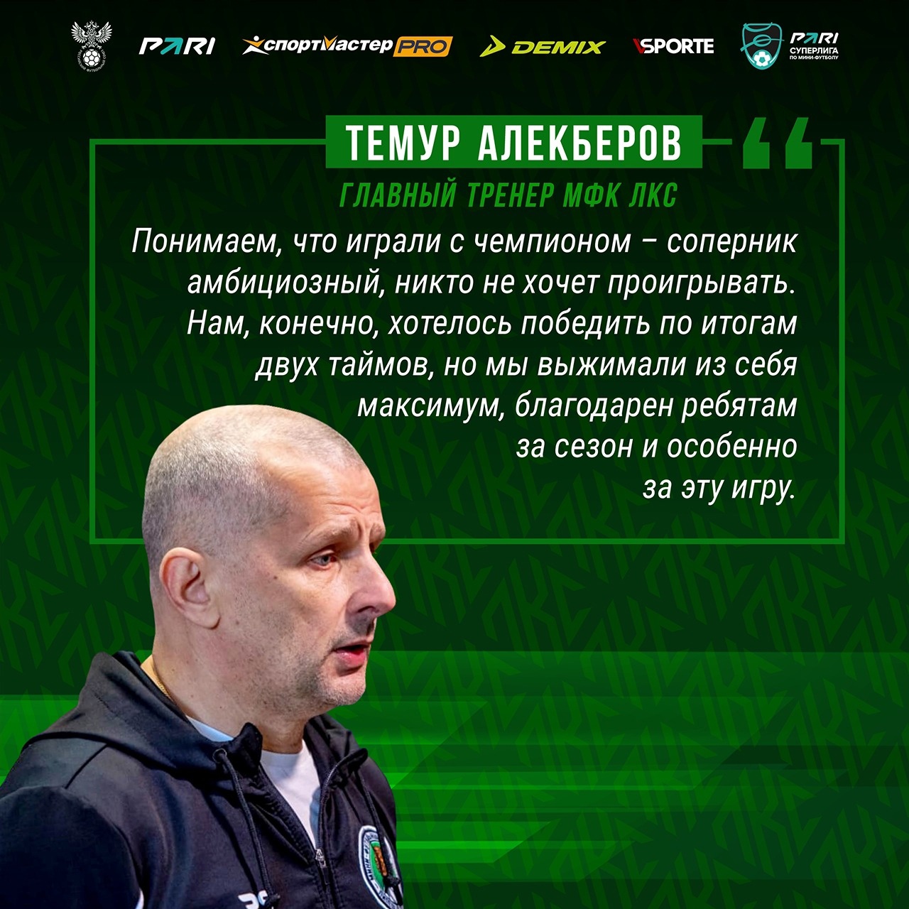 – Понимаем, что играли с чемпионом – соперник амбициозный, никто не хочет проигрывать, – сказал после матча главный тренер ЛКС Темур Алекберов. – Нам, конечно, хотелось победить по итогам двух таймов, но мы выжимали из себя максимум, благодарен ребятам за сезон и особенно за эту игру. Мы наконец нарушили традицию уходить с поражением в отпуск. Нам было важно показать, что мы – команда, проводили достаточно хорошие матчи, в том числе и против лидеров. Парни отнеслись очень серьёзно, я этому очень рад. Не раз говорил, что для нас очень много значат болельщики: мы видим, для кого мы играем, видим, что люди специально приезжают за нас болеть, вчера было очень много наших болельщиков в Климовске. Липецк начинает жить футзалом, нам важно возродить любовь к этому виду спорта во всей Липецкой области. На нас будет равняться всё развитие вида спорта в регионе.