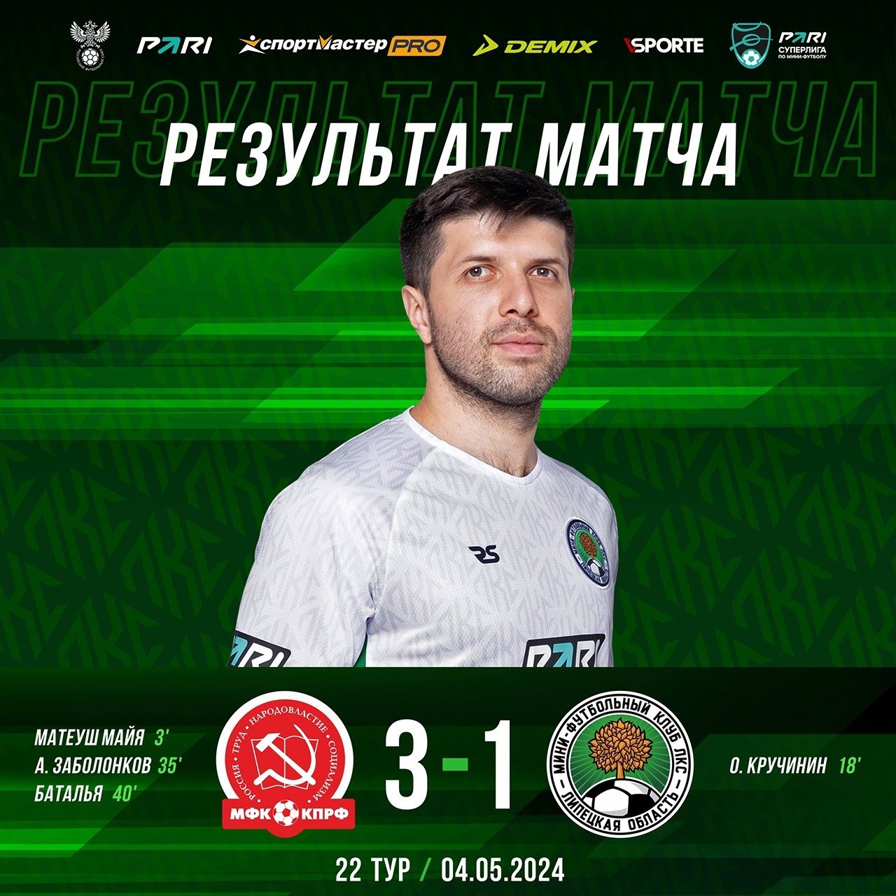 МФК КПРФ (Москва) – МФК ЛКС (Липецкая область) – 3:1 (1:1). PARI – Суперлига / Чемпионат России по мини-футболу среди мужских команд / сезон 2023/24, 22 тур, первый матч. 4 мая 2024 года. УСЦ «Юность» (Климовск, проезд Юности, 1). Голы: Матеуш Майя — 3 мин (1:0), Олег Кручинин — 18 мин (1:1), Андрей Заболонков — 35 мин (2:1), Баталья — 40 мин (3:1). Предупреждения: Фидан Низамутдинов. Фолы: 1 тайм — 1/4, 2 тайм — 5/4. На первый матч заключительного 22-го тура в Климовск поддержать мини-футбольный клуб ЛКС приехали полсотни болельщиков. Липчане начали активно, но пропустили первыми. На 3-й минуте Матеуш Майя убежал к воротам Леона Геджуа и пробил точно в «девятку». На 6-й минуте ЛКС мог сравнять счëт, но серия ударов по воротам Артëма Салахова не привела к голу. На 11-й минуте после удара Владислава Ахукова штанга спасла липчан от второго пропущенного мяча. На 14-й минуте Геджуа отразил опасный удар Арсера Багирова в нижний угол. На 18-й минуте липчане заработали угловой, и после тайм-аута шикарно его разыграли, Олег Кручинин замкнул передачу Александра Коробейникова.