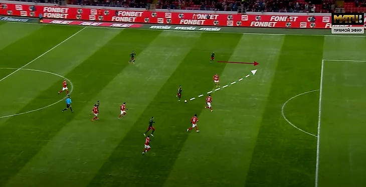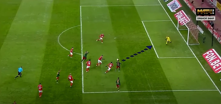 Отлично игроки Спартака используют ошибку противника (пас в ноги сопернику). Вот так надо открываться разрывая оборонительную линию защитников. А вот нападающие Локомотива в аналогичной ситуации сыграли неправильно. В футболе как в шахматах, делаешь правильные шаги выигрываешь, неправильные проигрываешь. Только в футболе надо ещё просчитывать метры и скорость игроков.