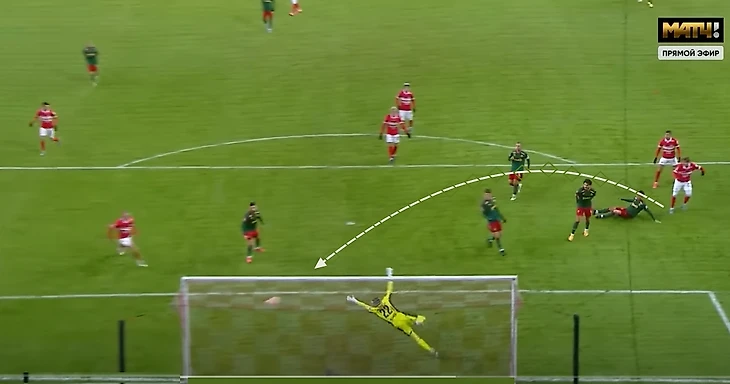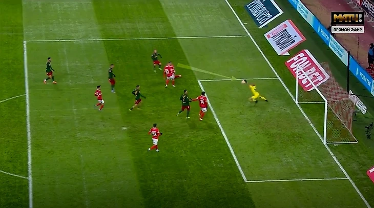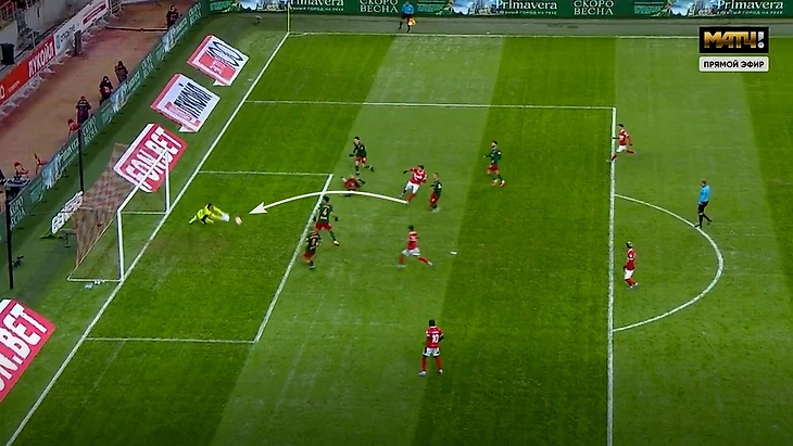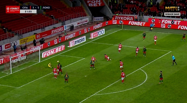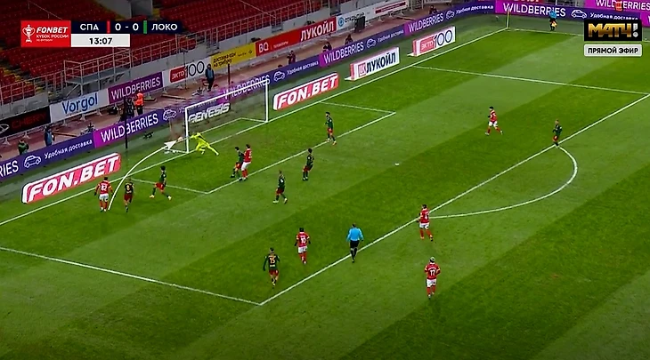 Атака "Спартака" слева от штрафной Лантратова, откуда теперь уже Хлусевич с разворота метров с 10-ти стреляет, при этом в своём случае целит он под ближнюю от себя стойку, вынуждая вратаря "Локомотива" перевести снаряд в падении за лицевую.