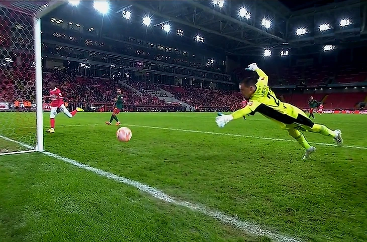 Максименко низом метров с 16-ти, ну а вратарь "Спартака" отражает снаряд в падении прямо перед собой!.....