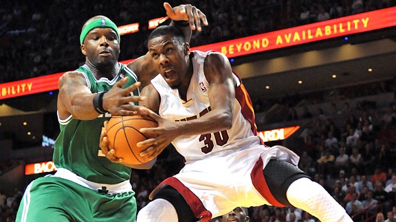 И скорее даже не просто защита, а подстраховка. Майамцы очень много подстраховывают, сдваиваются и размениваются. Это очень усложняет жизнь нападающей команде. Запомнился момент, когда Рондо пустил сквозняка из-под кольца, испугавшись приближающегося Уэйда.