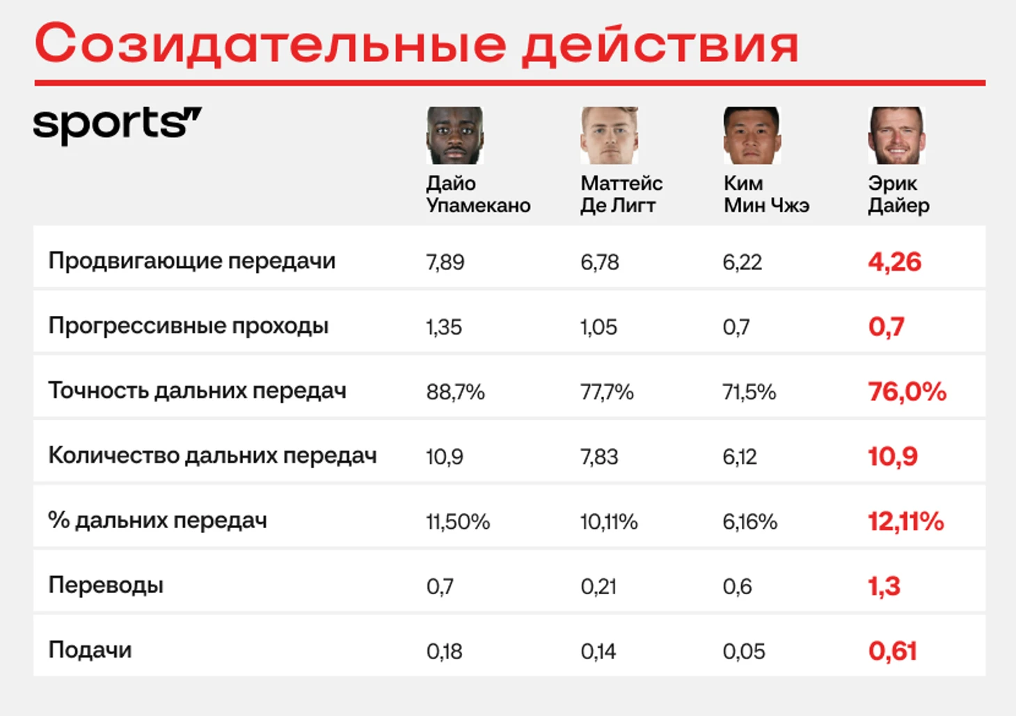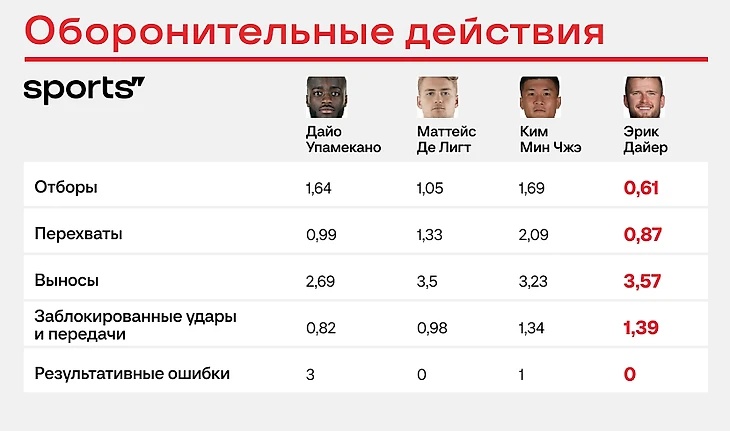 С точки зрения игры Дайер несколько отличается от тройки конкурентов. И Ким, и Де Лигт и Упамекано – агрессивные защитники, которые выдергиваются и далеко идут за соперником. Достаточно частый пример этого сезона – Упамекано уже находится в высокой позиции, но это не останавливает Кима от того, чтобы также пойти высоко.