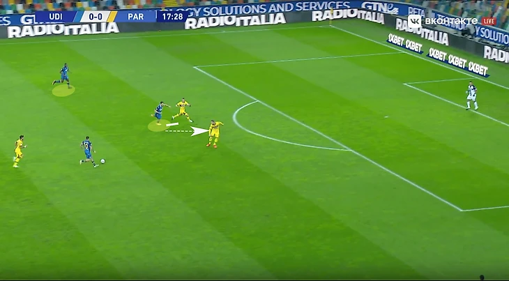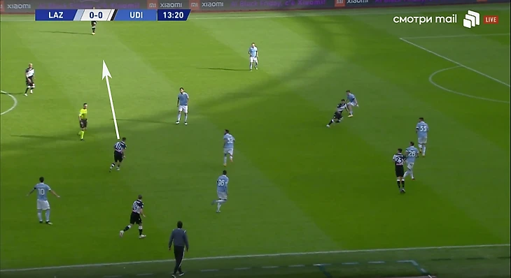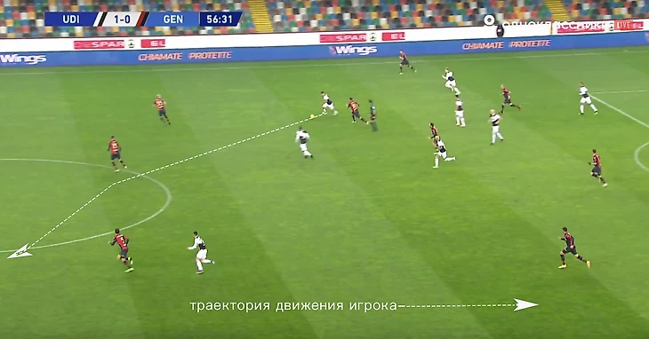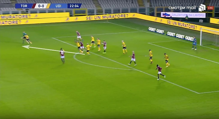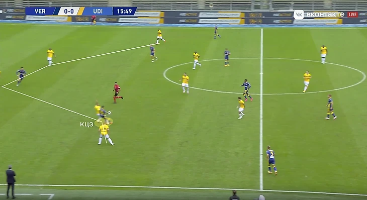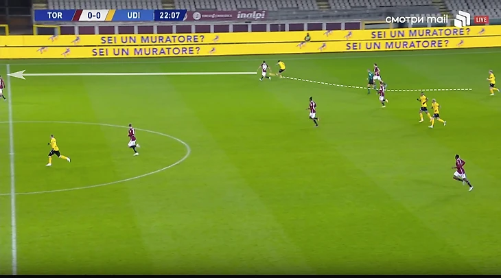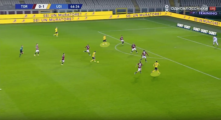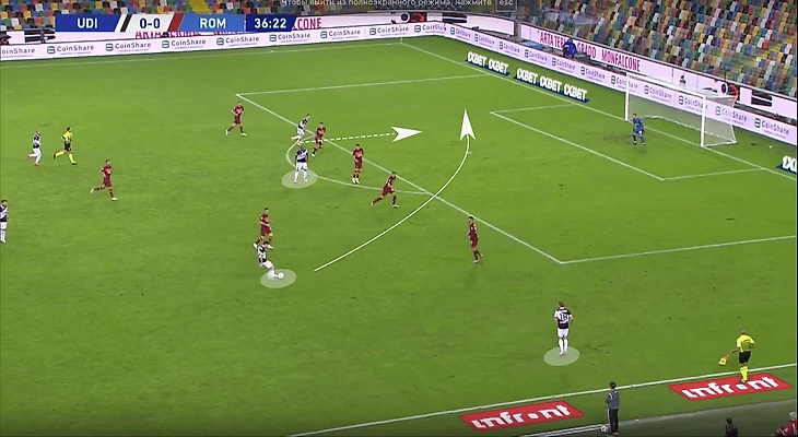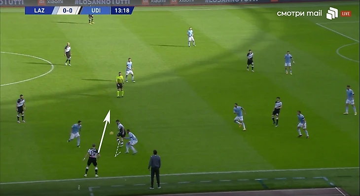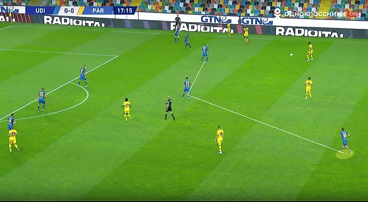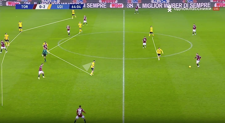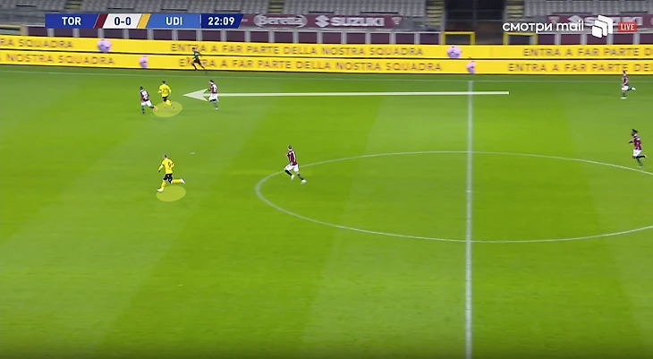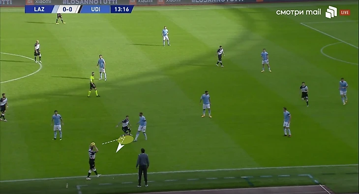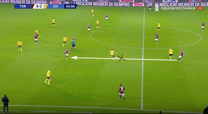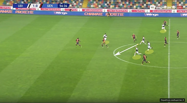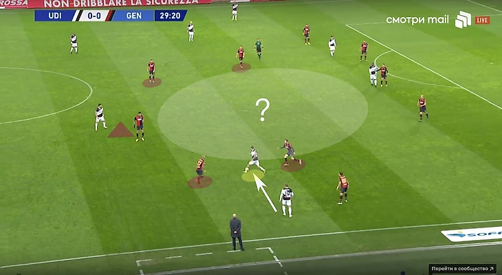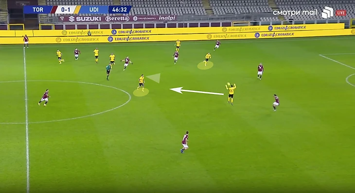 Когда соперник садится в оборону глубже и пространства для быстрого перехода нет, тогда у «Удинезе» появляются проблемы. Отсутствует общекомандное движение и заполнение всех нужных зон, поэтому часто возникают подобные ситуации: