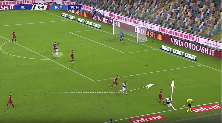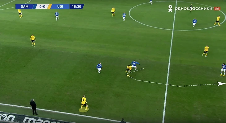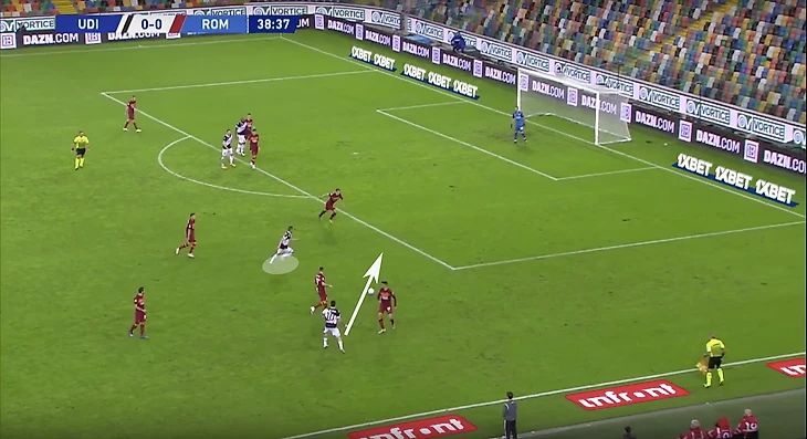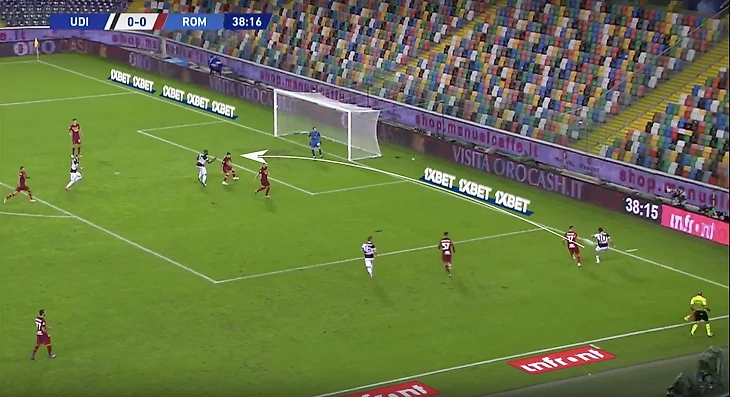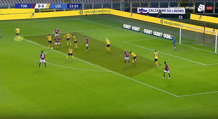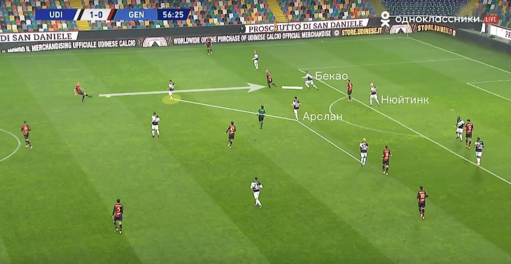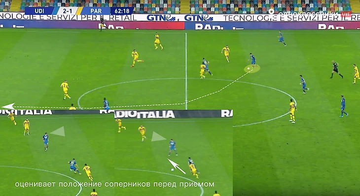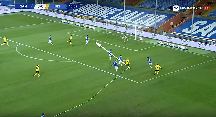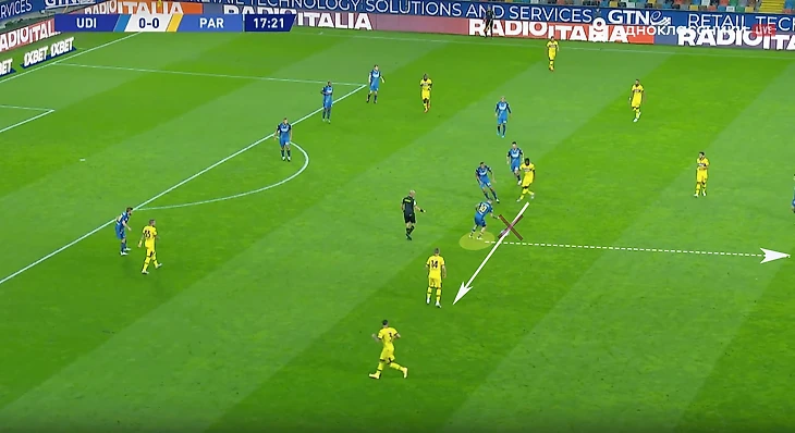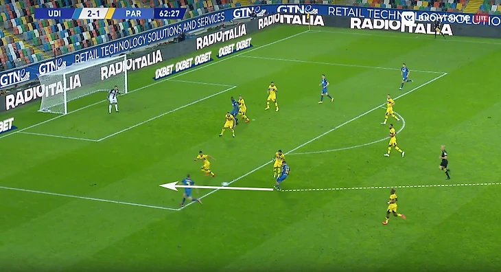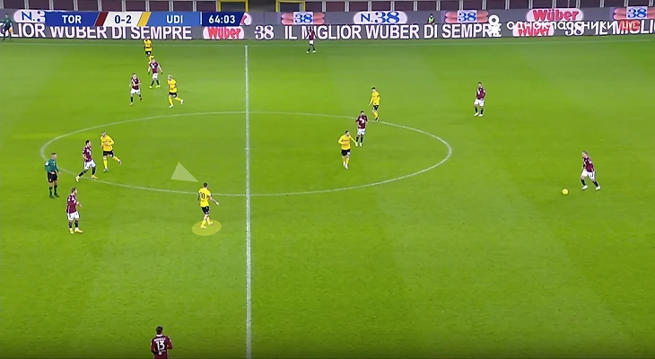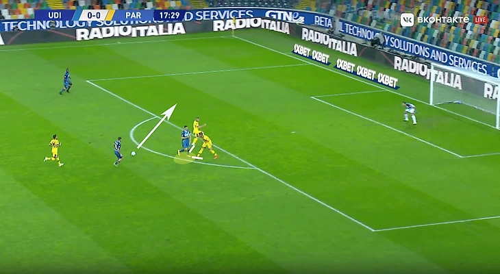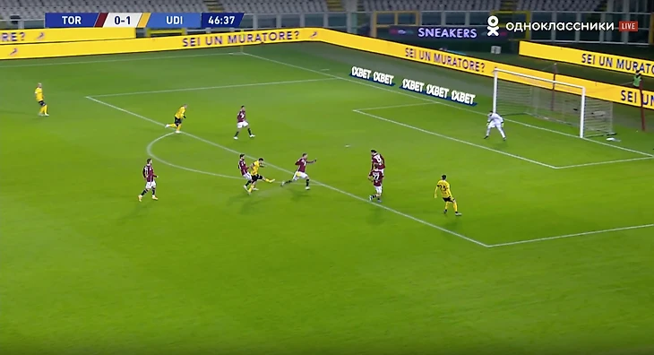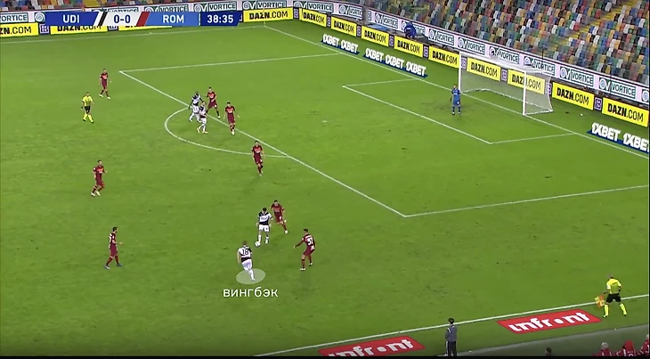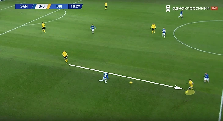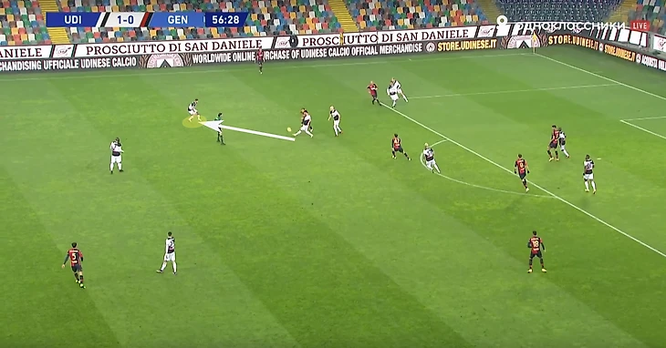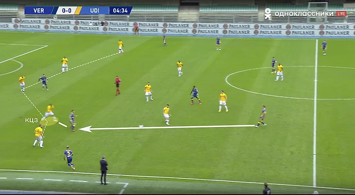 Когда соперник садится в оборону глубже и пространства для быстрого перехода нет, тогда у «Удинезе» появляются проблемы. Отсутствует общекомандное движение и заполнение всех нужных зон, поэтому часто возникают подобные ситуации: