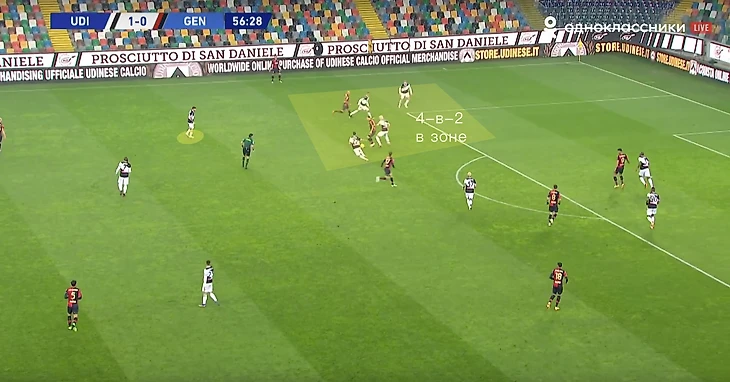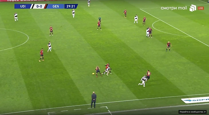 Выдвигается на игрока «Дженоа», ломая линию. Зону за спиной готовы подстраховать сразу несколько человек.