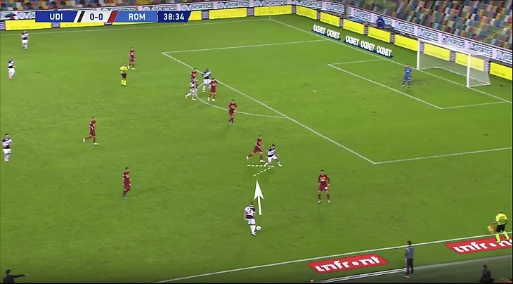 Чаще всего в позиционных атаках обострять игру у Удинезе получается через заготовленные паттерны. Вот некоторые, в которых участвует Родриго: