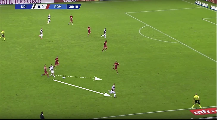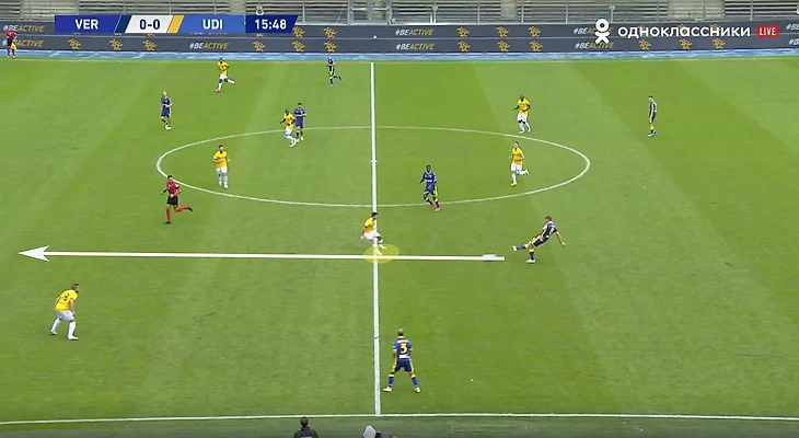 Все игроки «Удинезе» быстро разбегаются и поддерживают прорыв де Пауля, создавая несколько вариантов для передачи