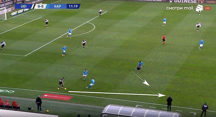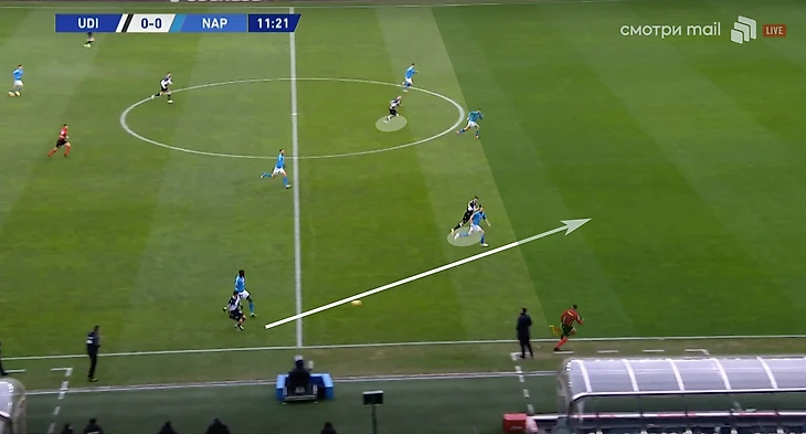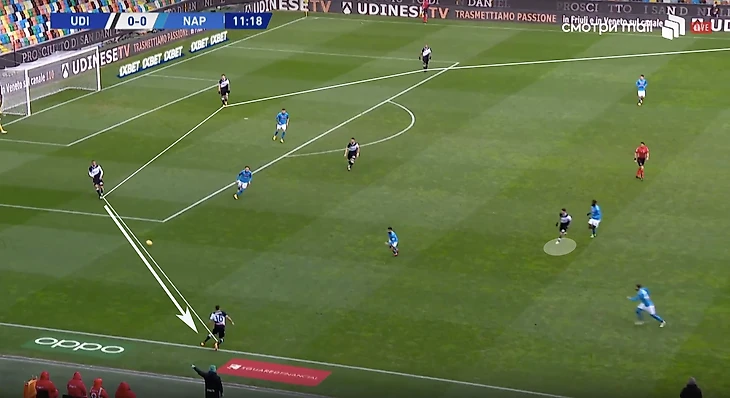 «Удинезе» ловит «Наполи» на попытке высокого прессинга и в пару передач доставляет мяч за спины оборонцам гостей