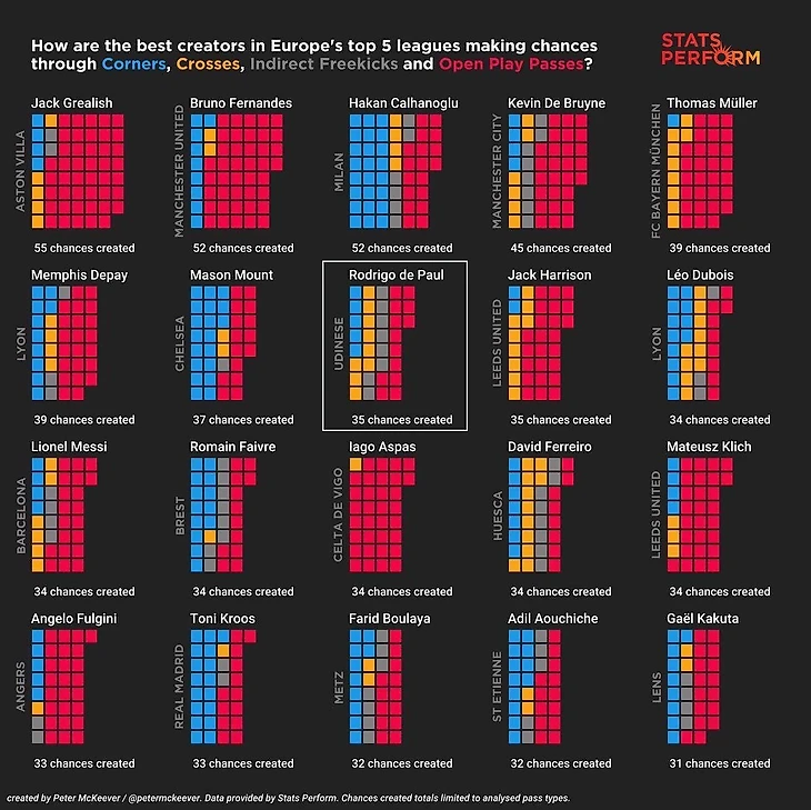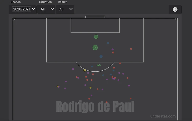 Важно рассмотреть и то, как де Пауль обостряет игру уже в финальной стадии атаки. Но в оценке его плеймейкреских способностей нужно уделять внимание контексту. В начале статьи был график, показывающий, как именно игроки - лучшие креативщики Европы создают свои моменты. У Родриго достаточно ровное распределение по каждому из вариантов. Однако, нужно разделять моменты, созданные в переходных фазах и при позиционных атаках, так как в зависимости от типа атаки от игрока требуются разные качества. При первом варианте, поскольку имеется пространство, а время ограничено, важны физические и технические данные в большей степени, такие как скорость, резкость, дриблинг. Опять-таки нужно отметить и заточенность команды под такой стиль игры, все действия проработаны до мелких деталей, ведь им уделяется больше времени в тренировочном процессе. Каждый игрок понимают куда и в какой тайминг бежать, взаимопонимание партнеров находится на высоком уровне.
