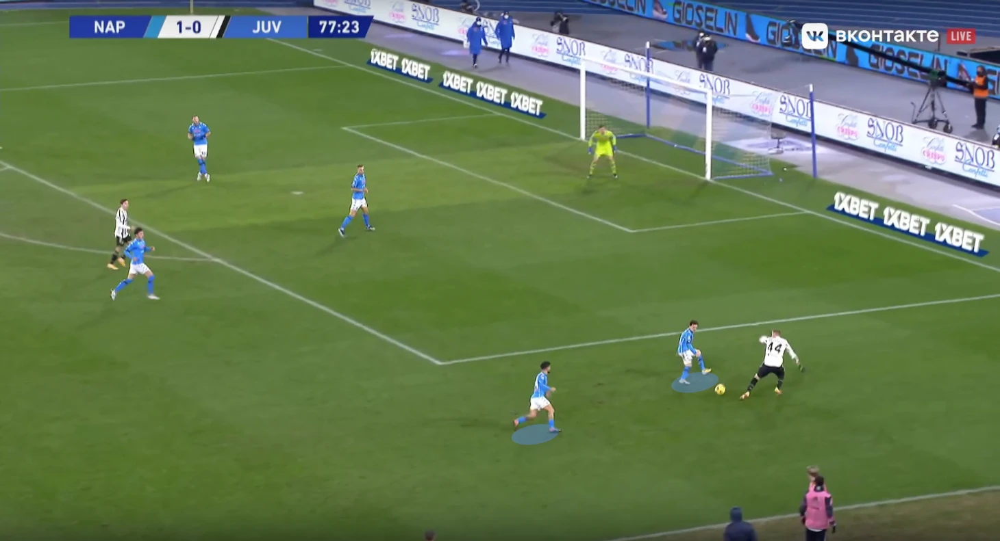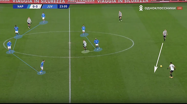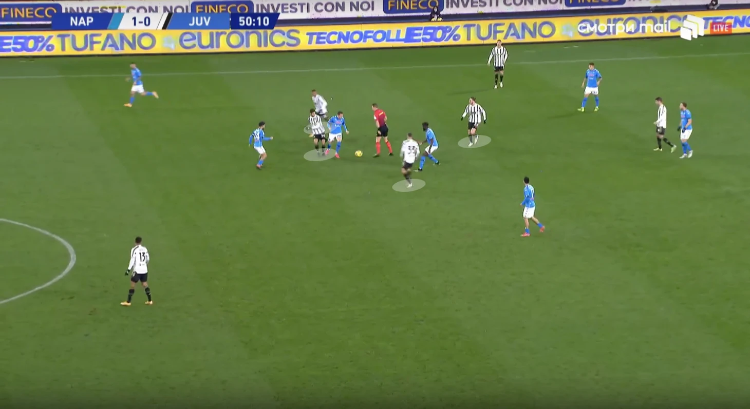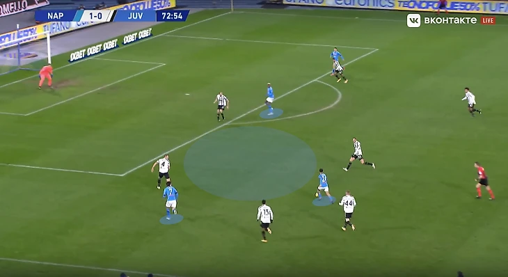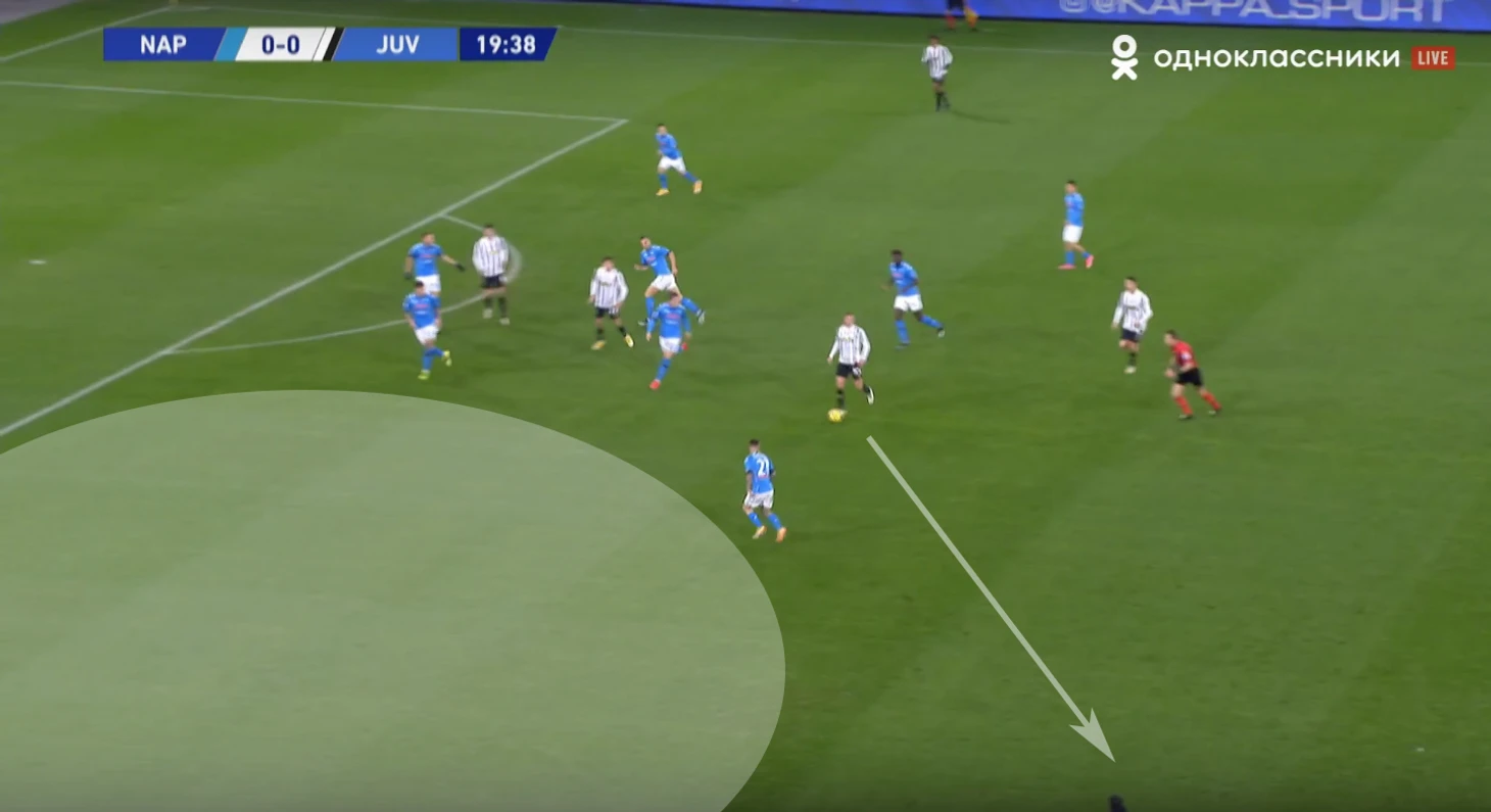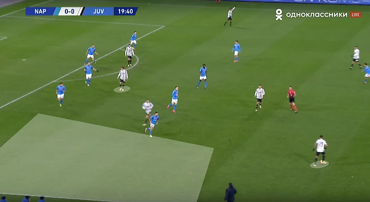 Двойку в первом оборонительном редуте у Наполи образовывали Осимьен и Инсинье. В среднем блоке они слаженно двигались и старательно отрабатывали каждый игровой эпизод. Когда мяч был в первой линии Билл-апа у «Ювентуса», эта двойка вытесняла владение во фланги: они не оказывали прямого давления на игрока с мячом в первой линии Юве, а перекрывали возможные линии передач через центральную ось.