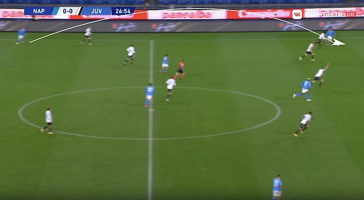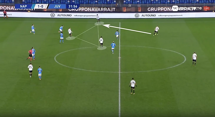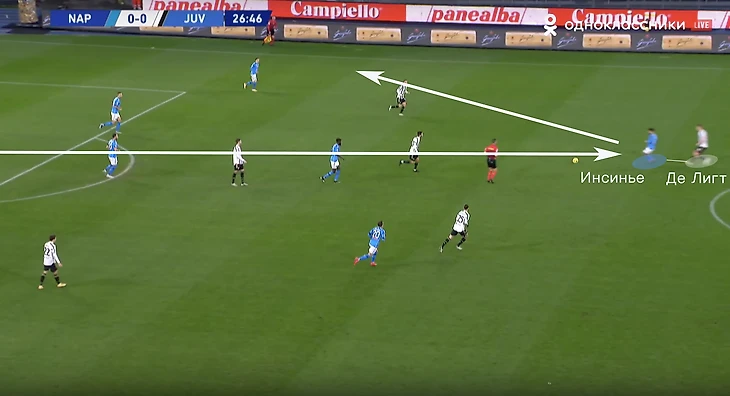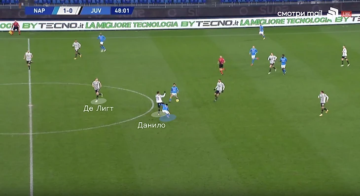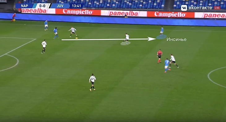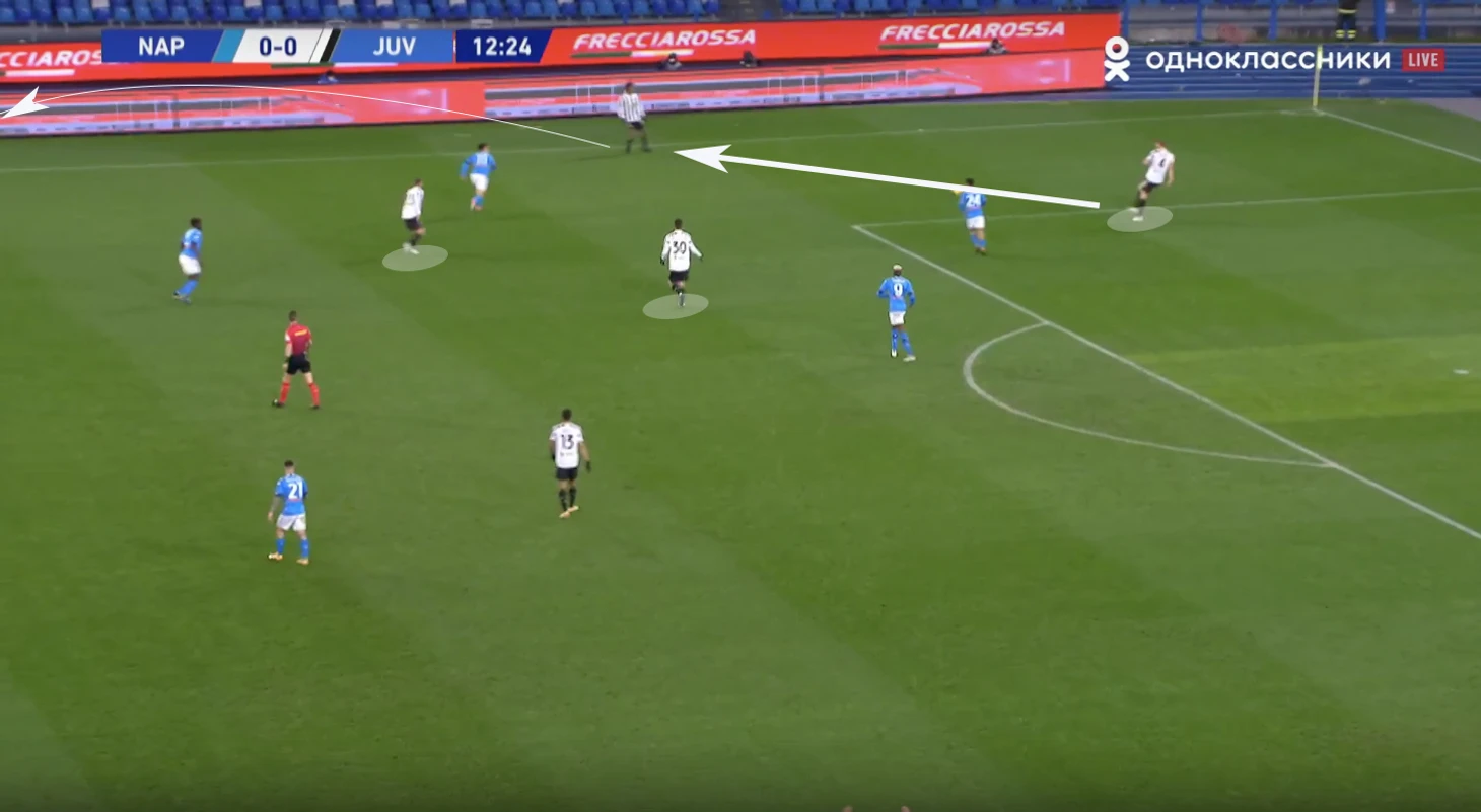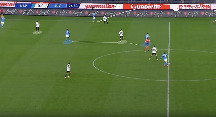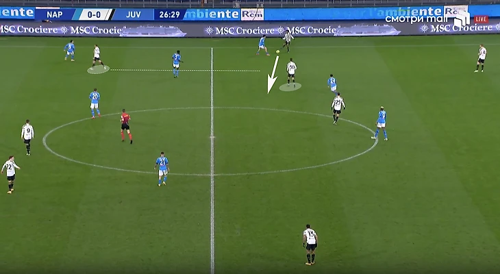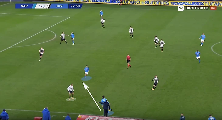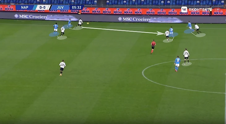 Двойку в первом оборонительном редуте у Наполи образовывали Осимьен и Инсинье. В среднем блоке они слаженно двигались и старательно отрабатывали каждый игровой эпизод. Когда мяч был в первой линии Билл-апа у «Ювентуса», эта двойка вытесняла владение во фланги: они не оказывали прямого давления на игрока с мячом в первой линии Юве, а перекрывали возможные линии передач через центральную ось.