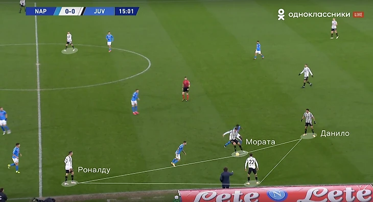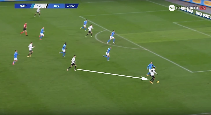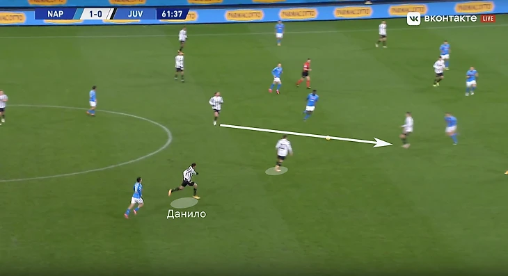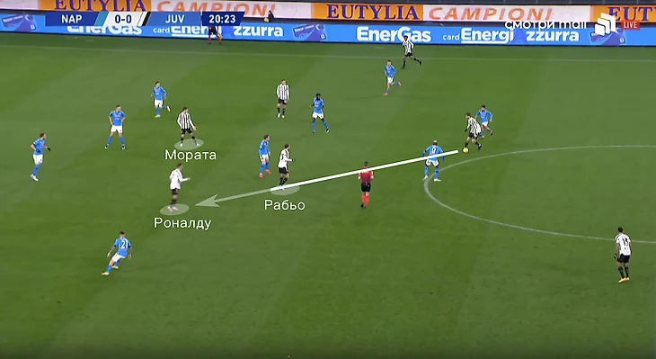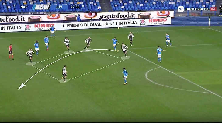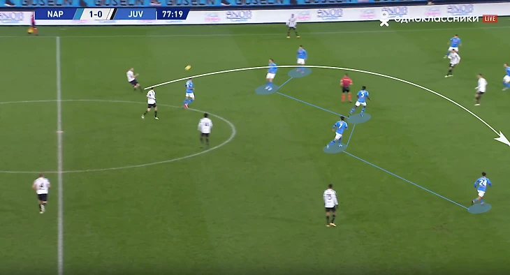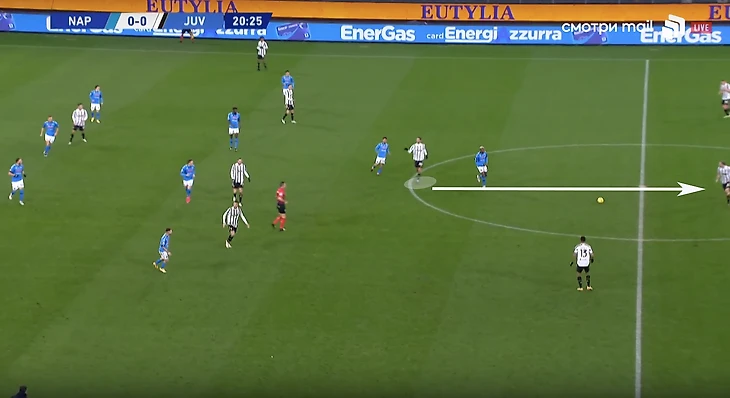 В продолжение этого же эпизода можно было увидеть, как подопечные Пирло планировали расшатывать блок неаполитанцев по горизонтали и доводить мяч в финальную треть.