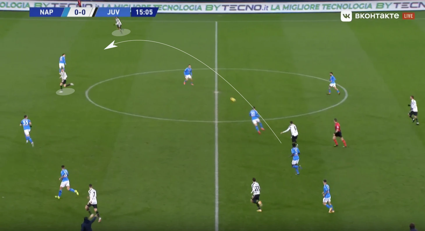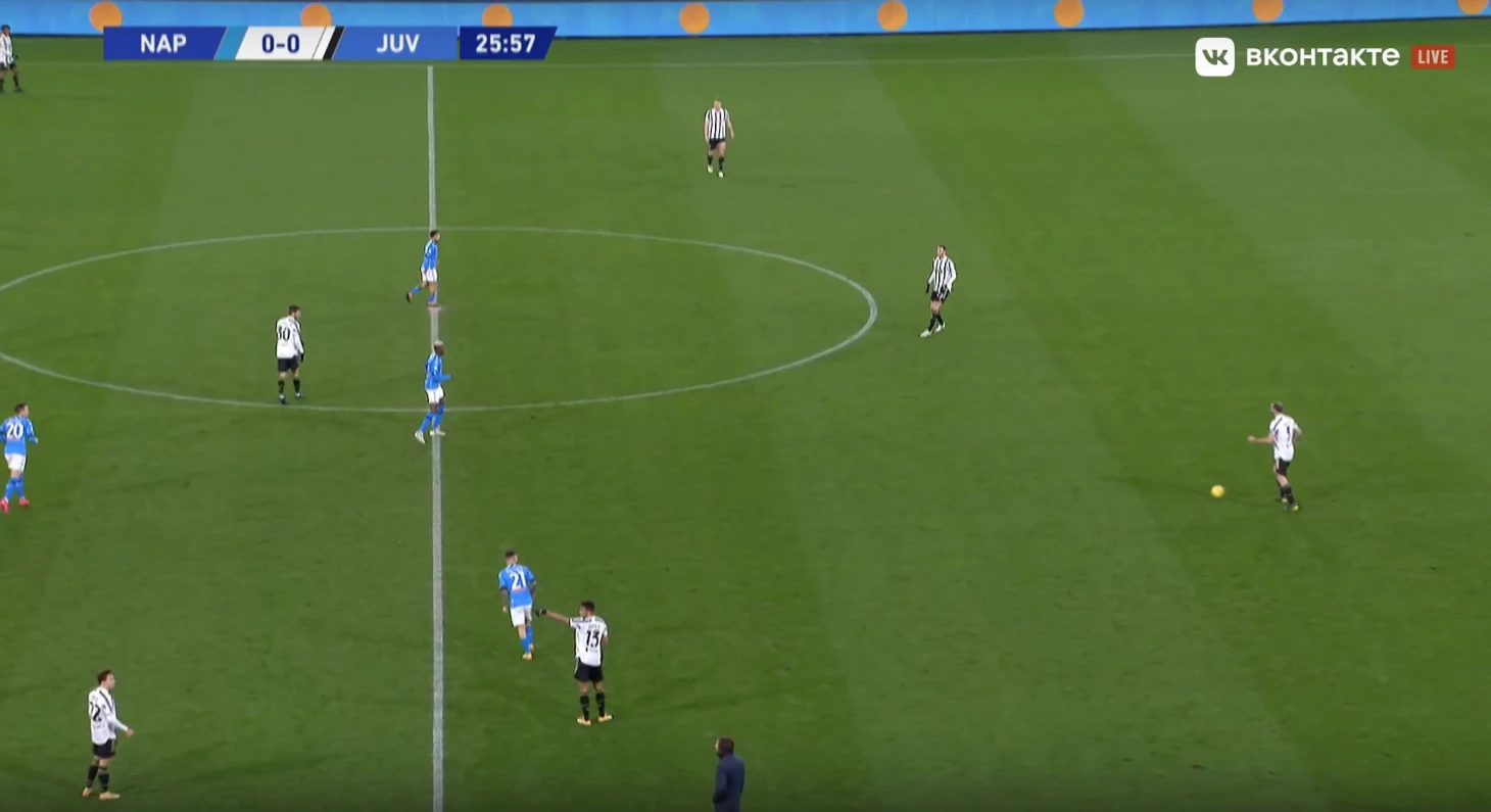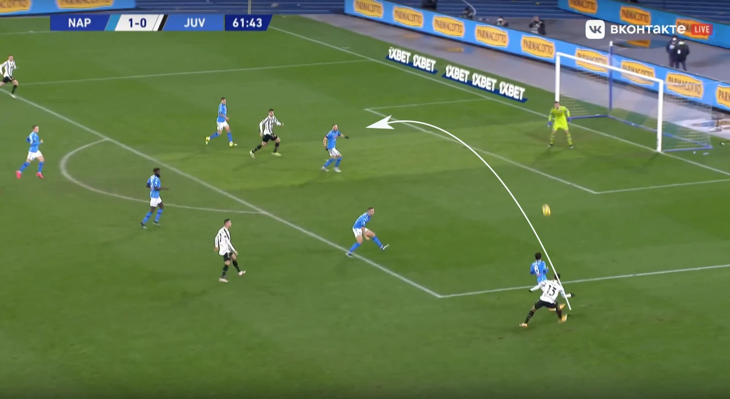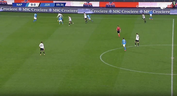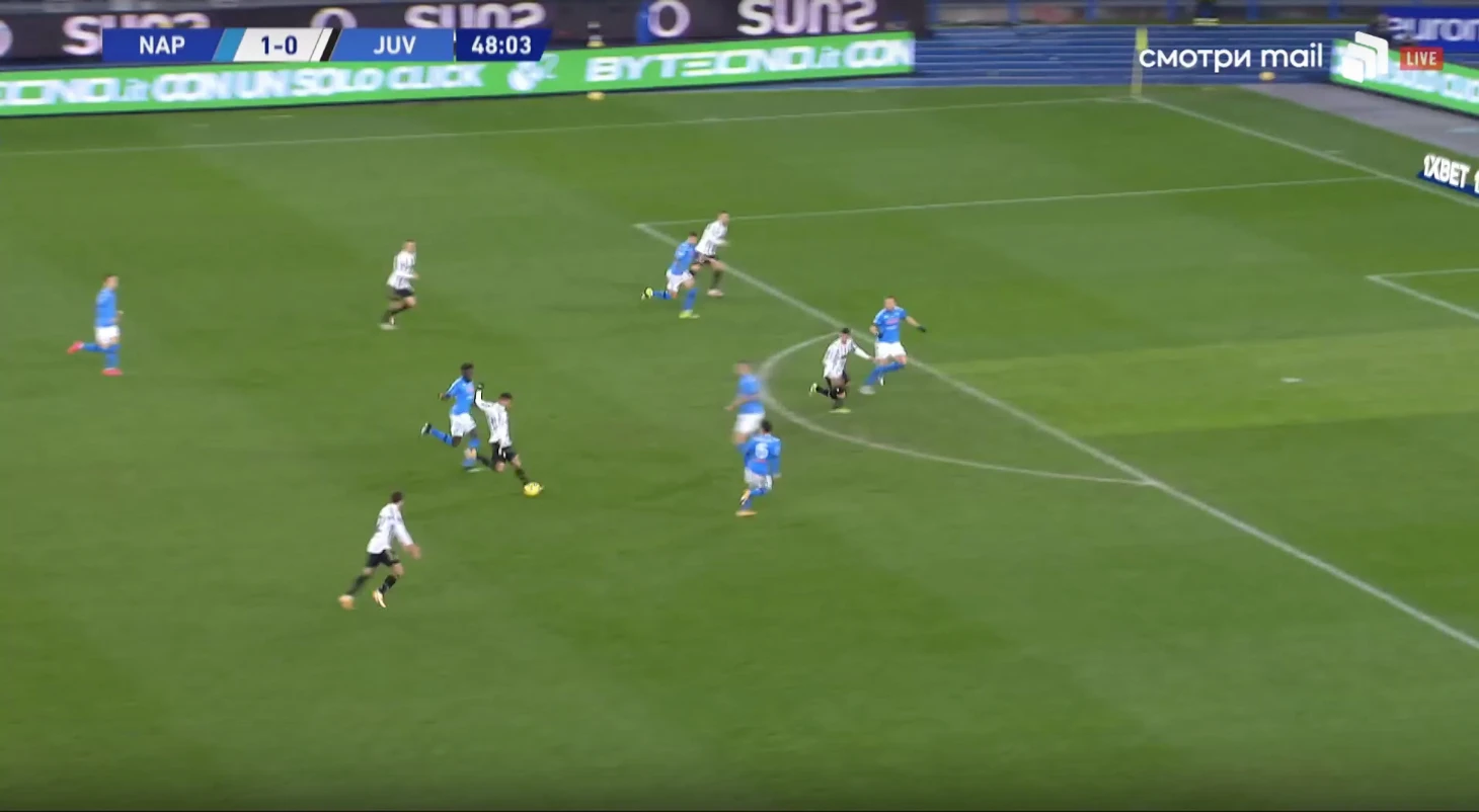 Прессинг Ювентуса тоже стал отлаженее (по Бакайоко теперь стал отвечать кто-то из пары центральных полузащитников, это маскировало недоработки Мораты). Из-за неимения вариантов выхода низом, Наполи приходилось чаще выходить через лонг-боллы, но оба цз Юве доигрывали персонально по Осимхену и Инсинье (итальянец старался забрать подбор).