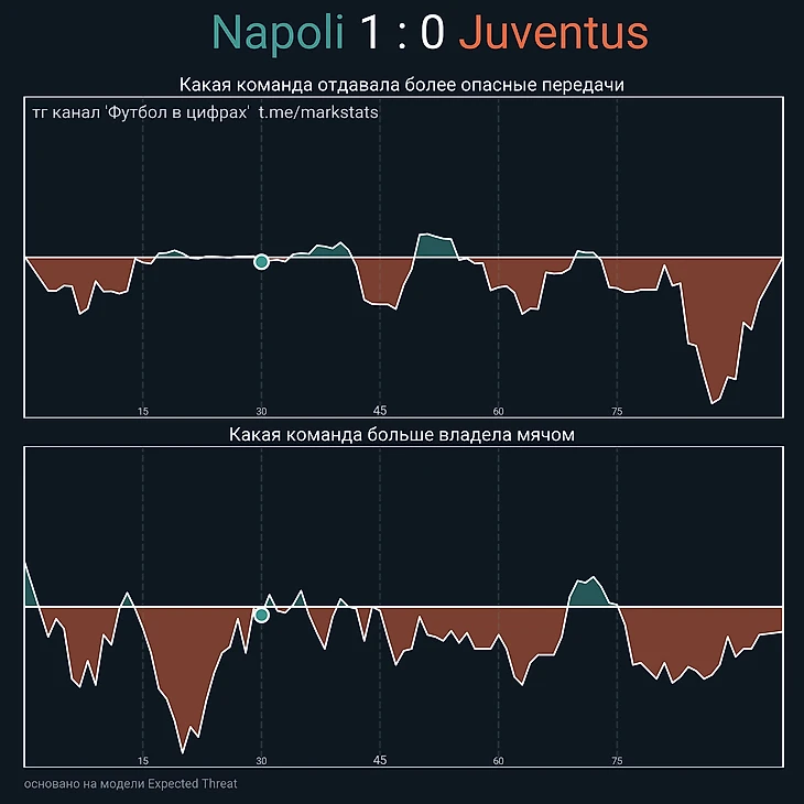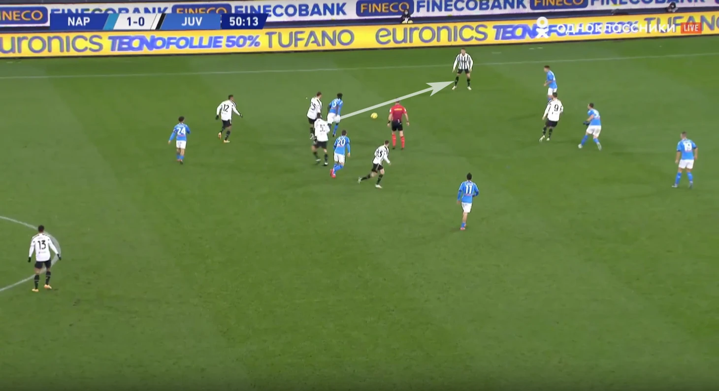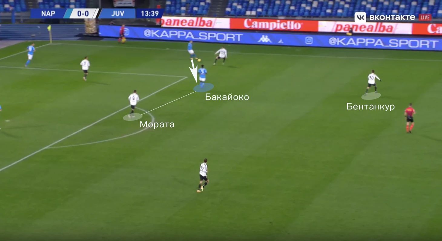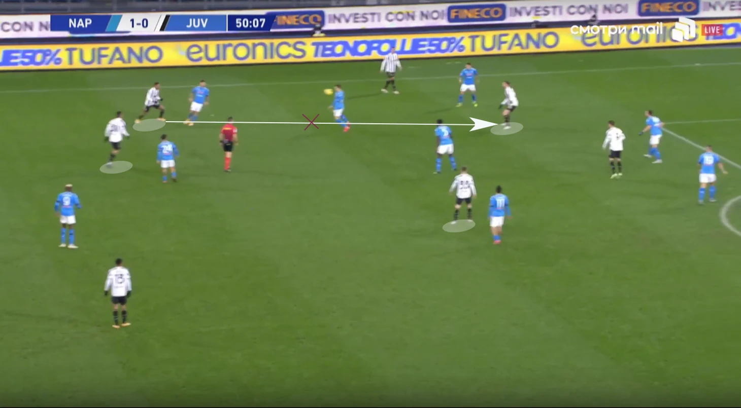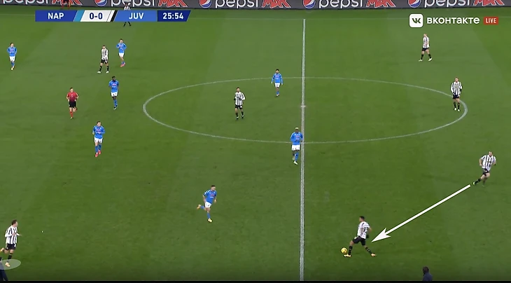 Прессинг Ювентуса тоже стал отлаженее (по Бакайоко теперь стал отвечать кто-то из пары центральных полузащитников, это маскировало недоработки Мораты). Из-за неимения вариантов выхода низом, Наполи приходилось чаще выходить через лонг-боллы, но оба цз Юве доигрывали персонально по Осимхену и Инсинье (итальянец старался забрать подбор).