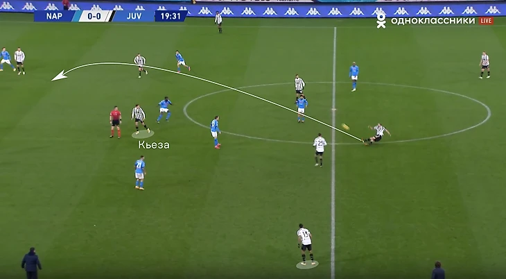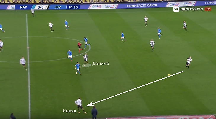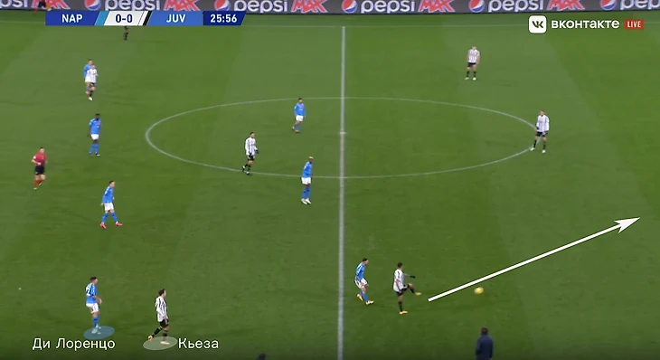 После половины первого тайма Кьеза, понимая, что на фланге по нему плотно играет Ди Лоренцо, стал чаще уходит в центр и предлагать себя между линий. Это давало больше вариантов развития атаки после контроля на правом фланге. Но из-за низкой позиции Данило, зона на левом фланге оставалась не заполненной: