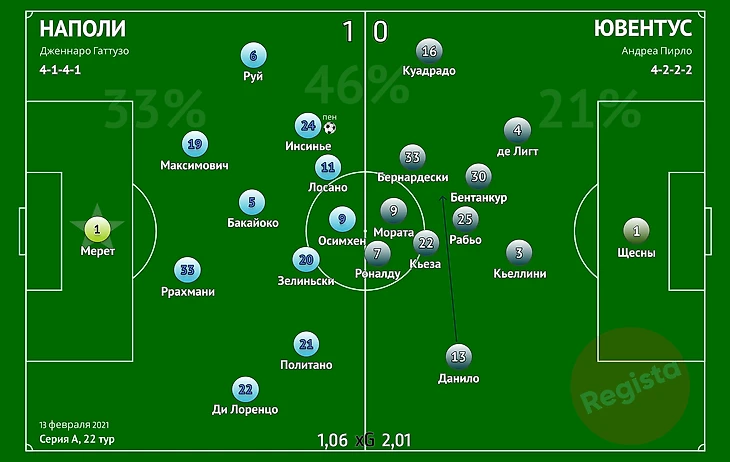 Но по причине практически безупречной игры подопечных Гаттузо и не самой быстрой циркуляции мяча от «Ювентуса», неаполитанцам удавалось контролировать игру, даже не владея мячом.