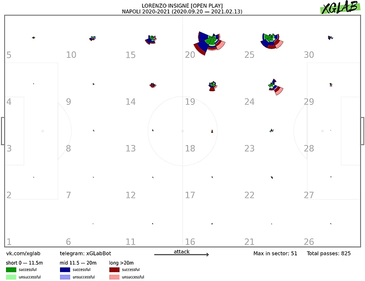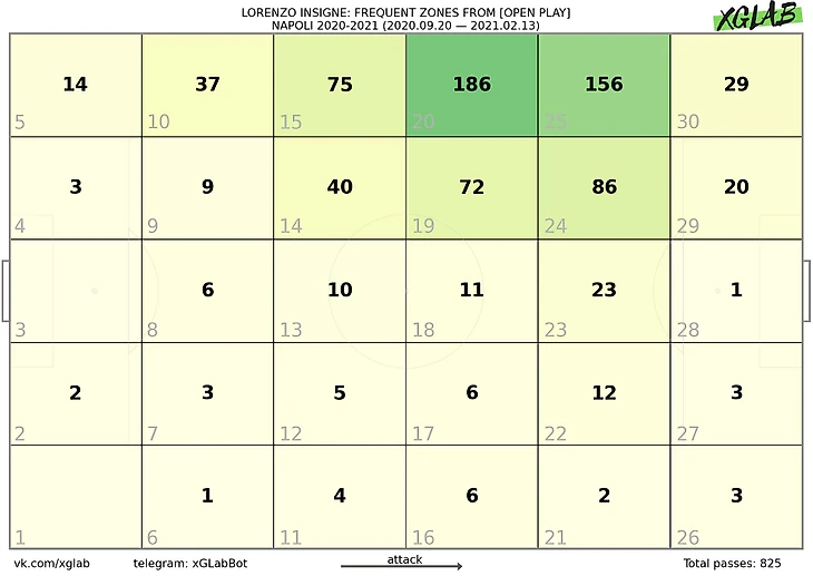 Обычно в первом тайме выходить низом получалось за счет двух ключевых деталей: недоработок Мораты (именно он должен был накрывать француза) по Бакайоко и уже типичных смещений Инсинье глубоко во фланг/полуфланг, в зону между вингером и фулбэком. Лоренцо имеет достаточно свободную роль и часто смещается вглубь поля для помощи в развитии атаки или прохождении прессинга.