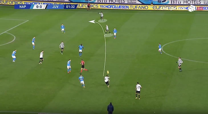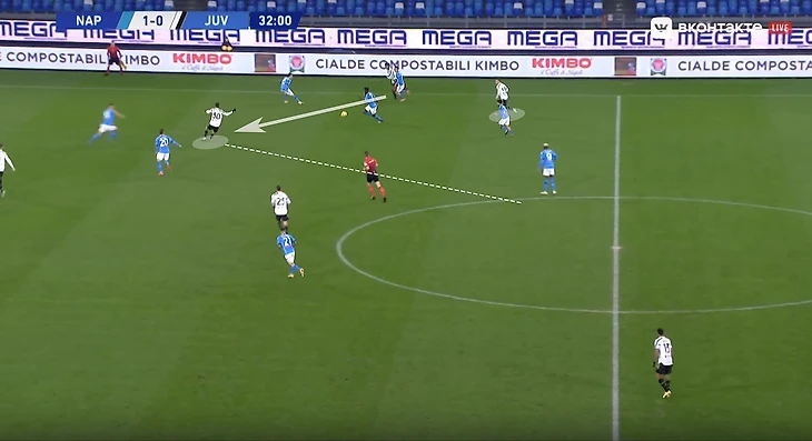В первом тайме, как было сказано выше, «Ювентус» был готов к тому, что центр поля будет перекрыт и делал акцент на фланговой игре. Были видны попытки раскачать блок Наполи 4-4-2 по горизонтали (узкое расположение команды при такой схеме делает ее уязвимой как раз к переводам с фланга на фланг).