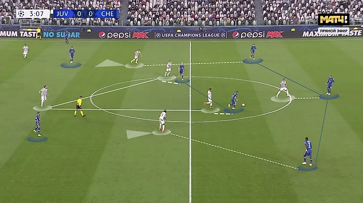 2) "Челси" слишком хорошо пользовался секундами свободы при сменах опеки игроками хозяев (особенно на флангах, когда свободу получал Алонсо), шикарно двигал мяч через полупространства, растягивая оборону хозяев и создавал опасность.