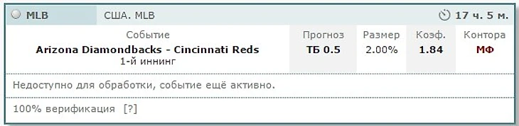05:10 Arizona Diamondbacks - Cincinnati Reds. 1-й иннинг ТБ 0.5 К=1.84 Марафон 300 +++