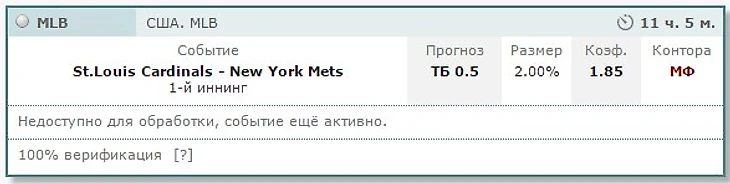 23:10 St.Louis Cardinals - New York Mets. 1-й иннинг ТБ 0.5 К=1.85 Марафон 300 ---