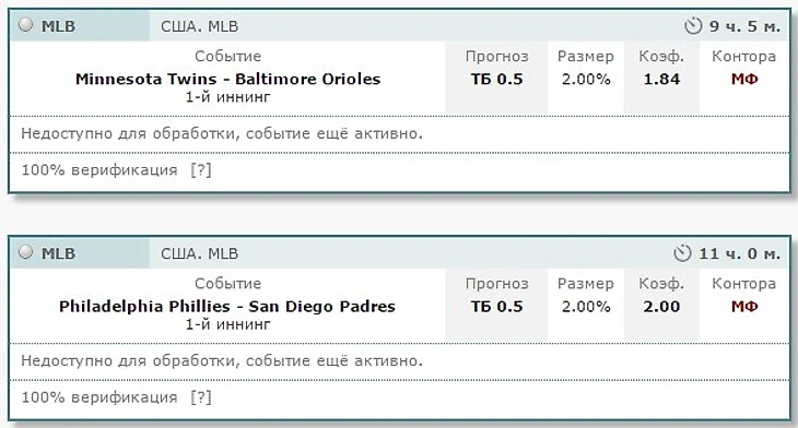 23:05 Philadelphia Phillies - San Diego Padres. 1-й иннинг ТБ 0.5 К=2.00 Марафон 300 ---