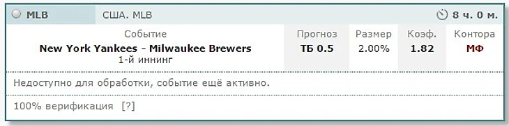 20:05 New York Yankees - Milwaukee Brewers. 1й иннинг ТБ 0.5 К=1.82 Марафон 300 +++