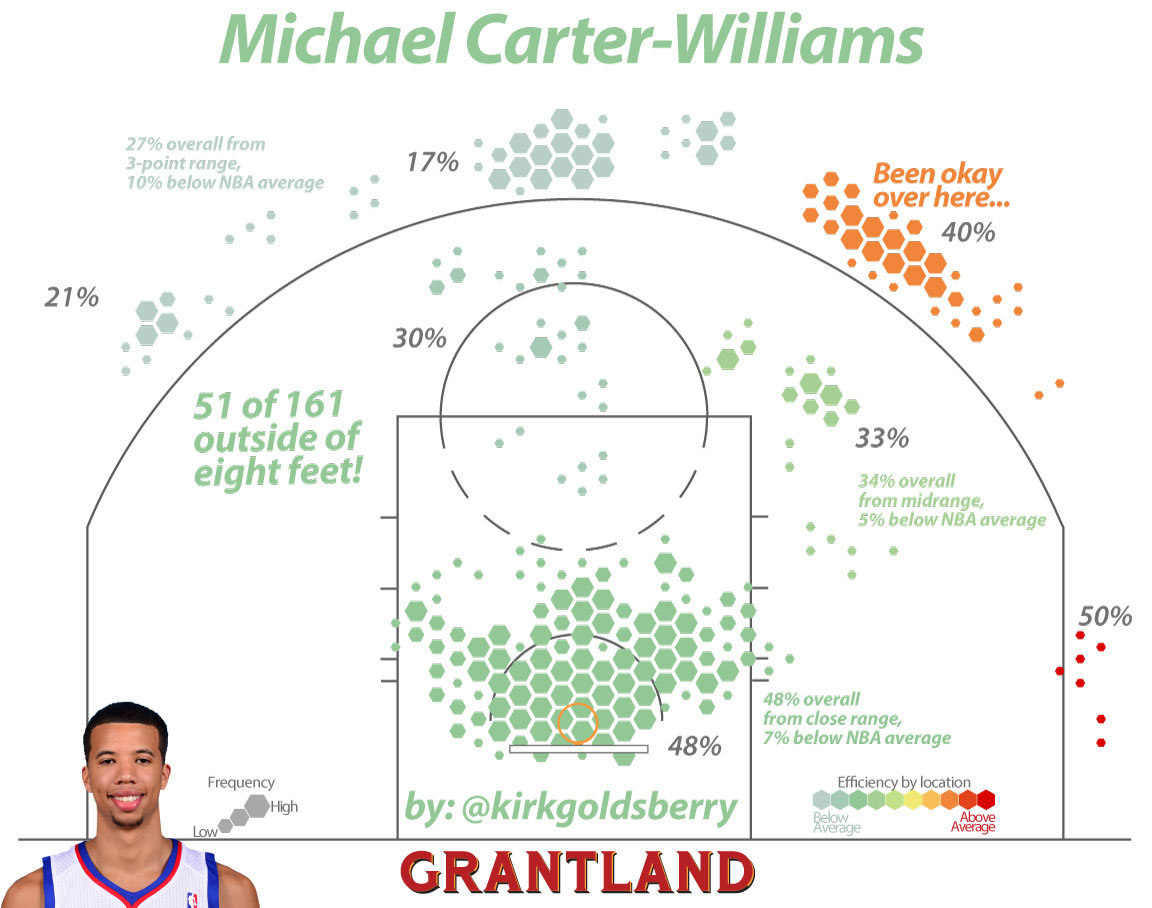 После многообещающего старта, его эффективность стремительно падает. Картер-Уильямс реализовал меньше трети бросков за пределами восьми футов и был ужасен при бросках «в лоб», где отлично играют другие разыгрывающие, например, Лиллард или Кальдерон. «Сиксерс» больше всех остальных команд нуждаются в классном тренере по броскам. Картер-Уильямс, Ротен и Ноэл обладают огромным потенциалом, но неумение бросать может помешать реализации их таланта.
