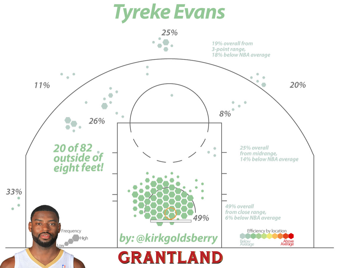 Я не в состоянии согласовать два этих факта: как игрок, столь хорошо исполняющий штрафные, может так ужасно атаковать с игры. К его чести, Эванс кажется достаточно умным и не бросает джап-шоты пачками, но это бесполезно. Его штрафные показывают, что у Тайрика достаточно мягкая кисть, но при бросках с ведения что-то нарушается в механике броска. Кажется, что хороший тренер сможет это поправить, и, если Эванс начнет попадать броски со средним для лиги процентом, общий уровень его игры заметно повысится. Он умеет почти все в атаке, но отсутствие хорошего броска с дистанции позволяет его опекунам активнее защищаться от прохода Тайрика.