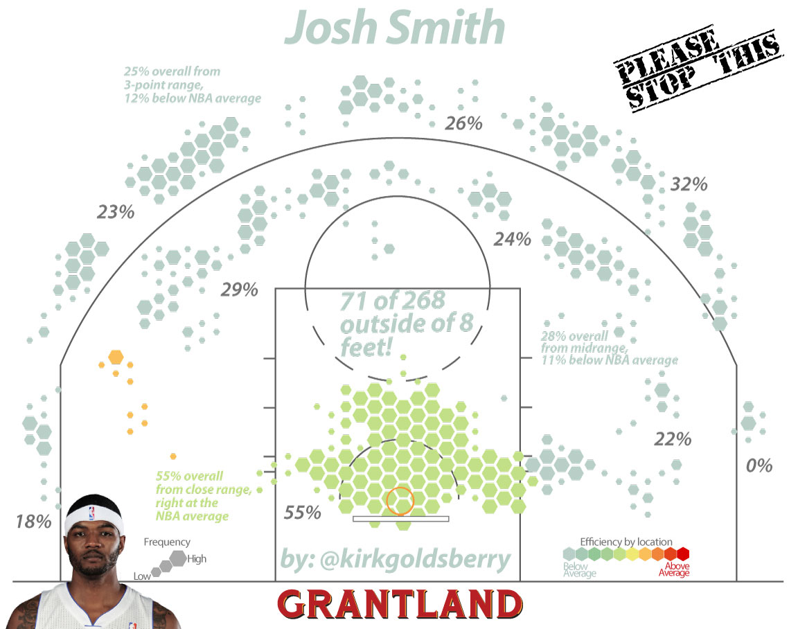 Я все еще так думаю, но «Детройт» ему не подходит, по крайней мере, сейчас. Там нестабильно; тактика в нападении, как минимум, неясна; с молодыми Монро и Драммондом Джошу не находится места в фронткорте. В результате, Смит слишком много играет на позиции третьего номера и бросает с дистанции больше, чем в «Атланте».