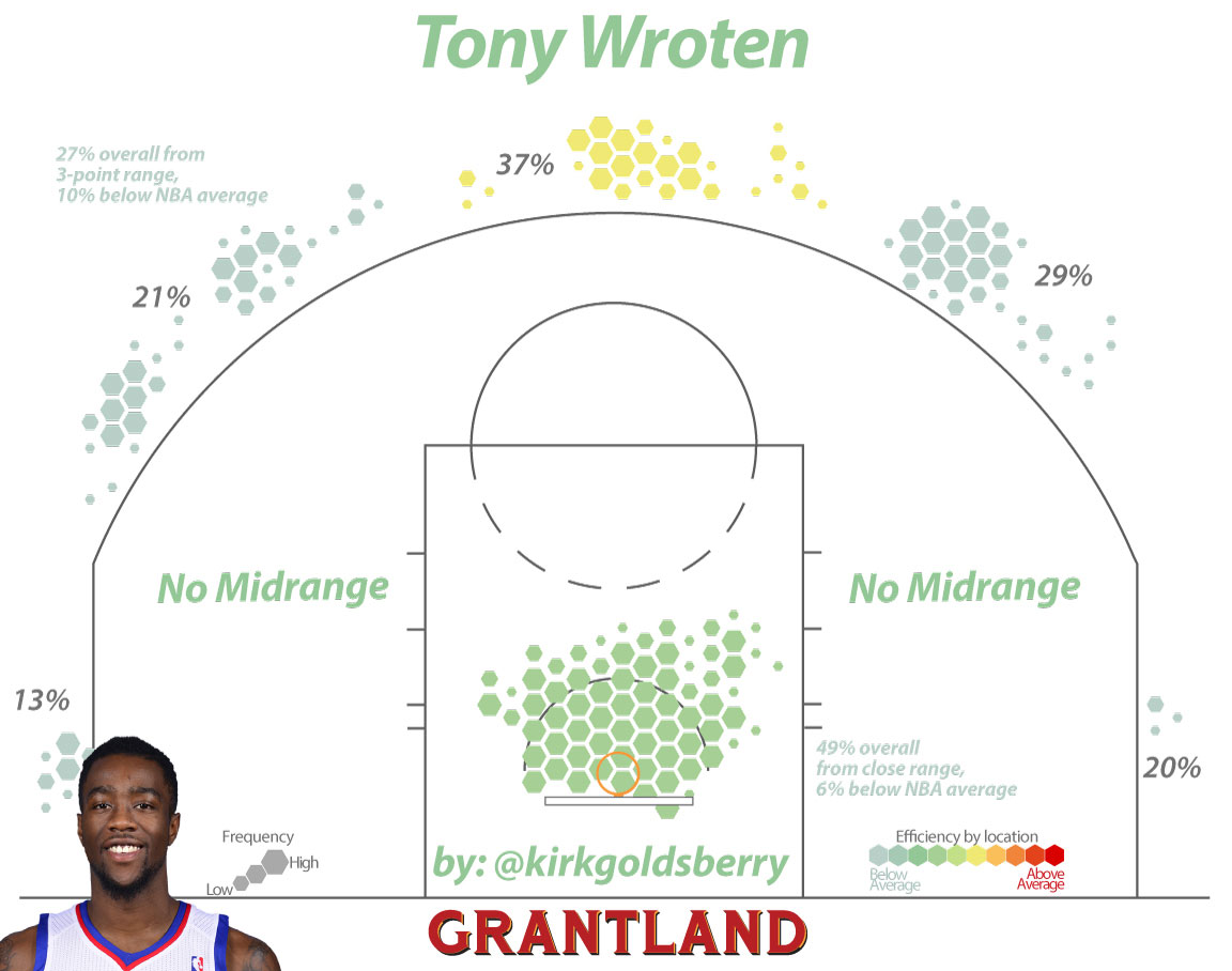 Схема бросков Ротена выглядит, как будто он играет за «Хьюстон»; никаких бросков со средней. Но, в отличие от игроков «Рокетс», Тони не так часто попадает трехочковые. Он особенно активен из-за дуги, и он ужасен. Из 85 игроков, исполнивших минимум сто трех, он занимает 84-е место по эффективности. Спойлер:Джош Смит-восемьдесят пятый.