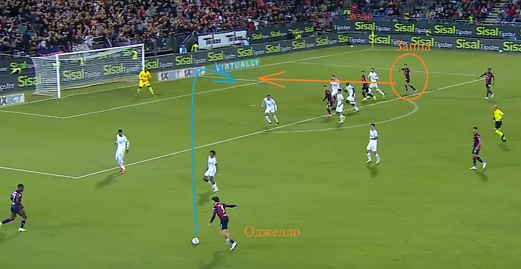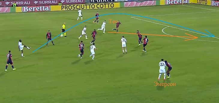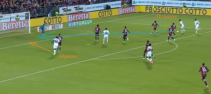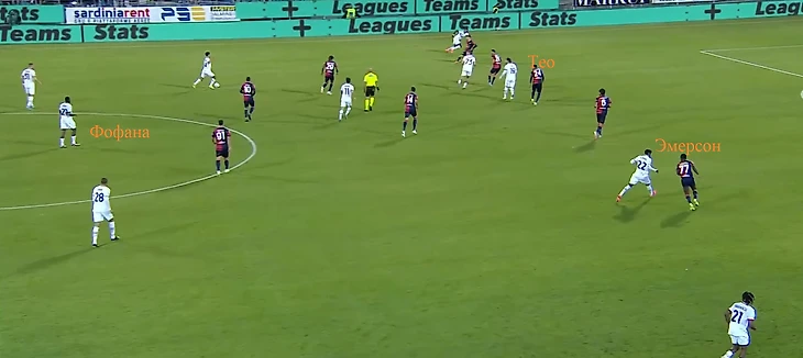 2) Постоянные рывки под заброс на ход за линию офсайда от очень большого количества игроков. Они постоянно раздёргивали защитников из офсайдной линии, вынуждали порой держать сзади по 6 человек в линию. Действительно, защитники «Кальяри» не знали, от кого ждать остроты. Такие рывки делали снова и снова буквально по очереди Камарда, Леао, Чуквуезе, Пулишич, Тео, Эмерсон - 6(!!!) разных игроков по всей ширине поля. И такое движение не прекращалось, пока счет был ничейный или «Милан» уступал.