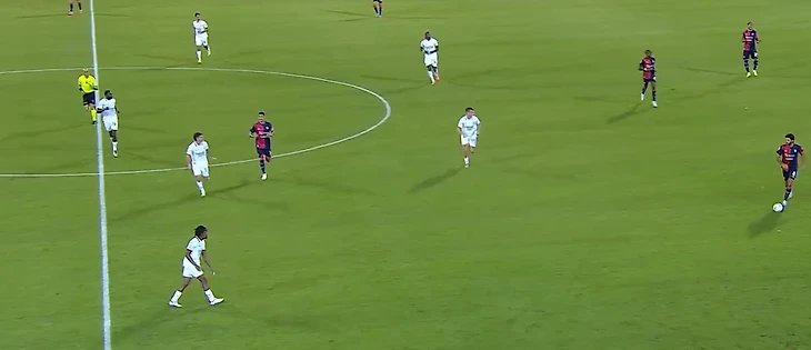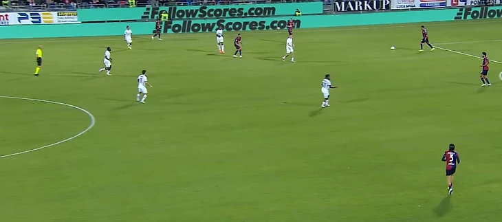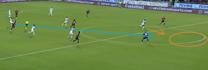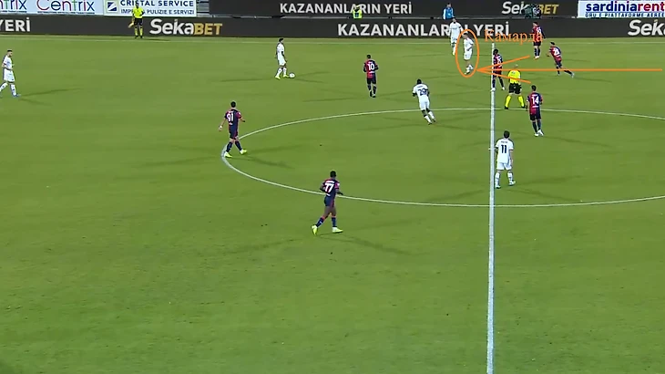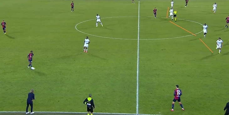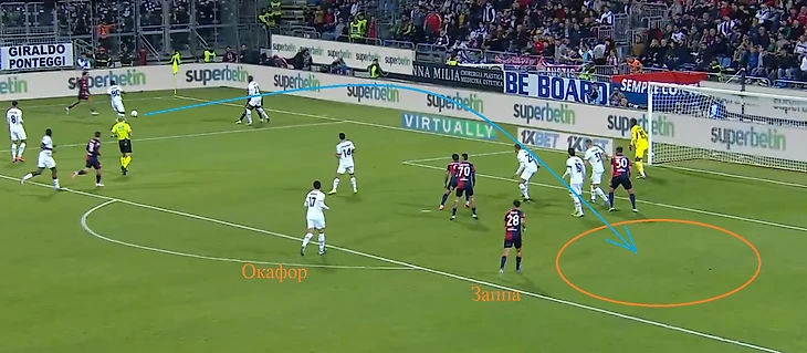Мне не ясна задумка Фонсеки при позиционной обороне. Большая группа из 6ти игроков располагается высоко, но в прессинг не идёт. Они препятствуют розыгрышу мяча низом через центр, но сзади с большим разрывом от этой группы ситуация 4 в 4 и при хорошем. При хорошем открывании и забросе верхом такой слабостью можно регулярно пользоваться. Помимо этого «Кальярии» регулярно удачно переходили на чужую половину через фланги. К такому приёму Паулу прибегает, видимо, в играх против всех более слабых соперников и нередко Милан получает по паре мячей, как в первых трёх турах.