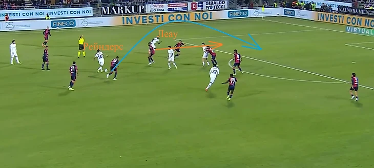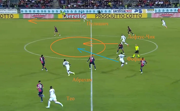 1) Регулярные открывания назад под короткую передачу поочерёдно от Камарды, Леао, Пулишича. За счет этого создавалась вариативность для возможной передачи, а также нарушался оборонительный порядок в рядах «Кальяри».